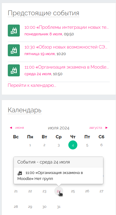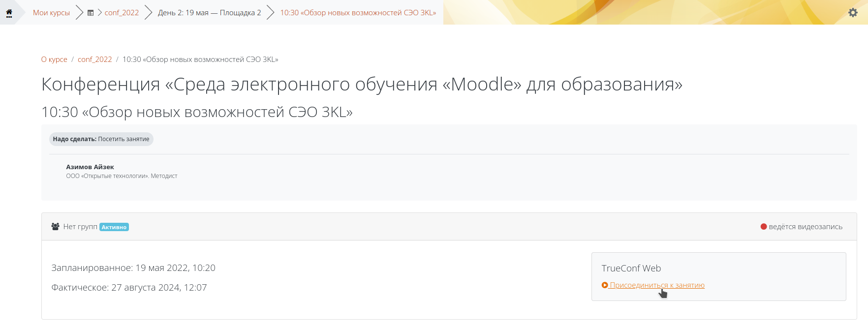 Курс-площадка «Конференция «Среда электронного обучения «Moodle» для образования», иллюстрирующая описываемый сценарий, доступен на нашем демо-стенде. Здесь вы можете попробовать себя в роли участника мероприятия или ознакомиться с настройками курса (для этого воспользуйтесь логином и паролем с главной страницы стенда).