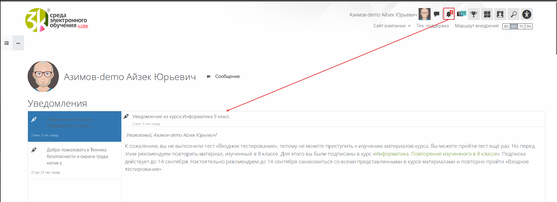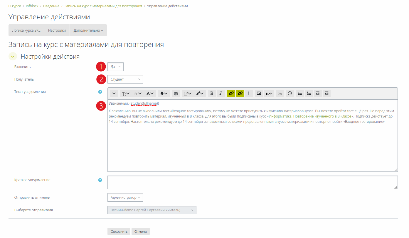 Текст уведомления = Уважаемый, {studentfullname}! К сожалению, вы не выполнили тест «Входное тестирование», потому не можете приступить к изучению материалов курса. Вы можете пройти тест ещё раз. Но перед этим рекомендуем повторить материал, изученный в 8 классе. Для этого вы были подписаны в курс «Информатика и информационные технологии. Повторение изученного в 1-ом семестре». Подписка действует до 14 сентября. Настоятельно рекомендуем до 14 сентября ознакомиться со всеми представленными в курсе материалами и повторно пройти «Входное тестирование». (см. поз. 3 Рис. 3.4.2).