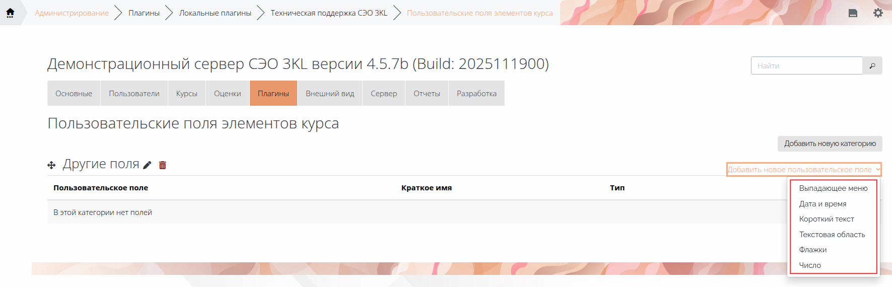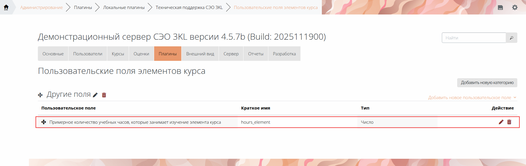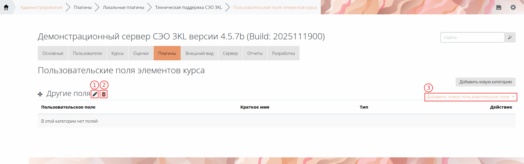 Страница расположена по пути Администрирование->Плагины->Локальные плагины->Техническая поддержка СЭО 3KL->Пользовательские поля элементов курса.