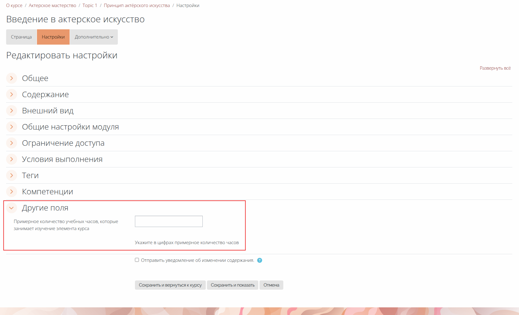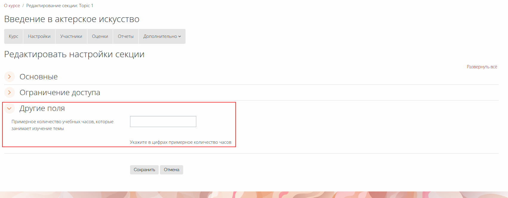 После сохранения формы добавленное поле появится на странице «Пользовательские поля секций курса» (Рис. 3.5.2) и на странице настроек секции (Рис. 3.5.3).
