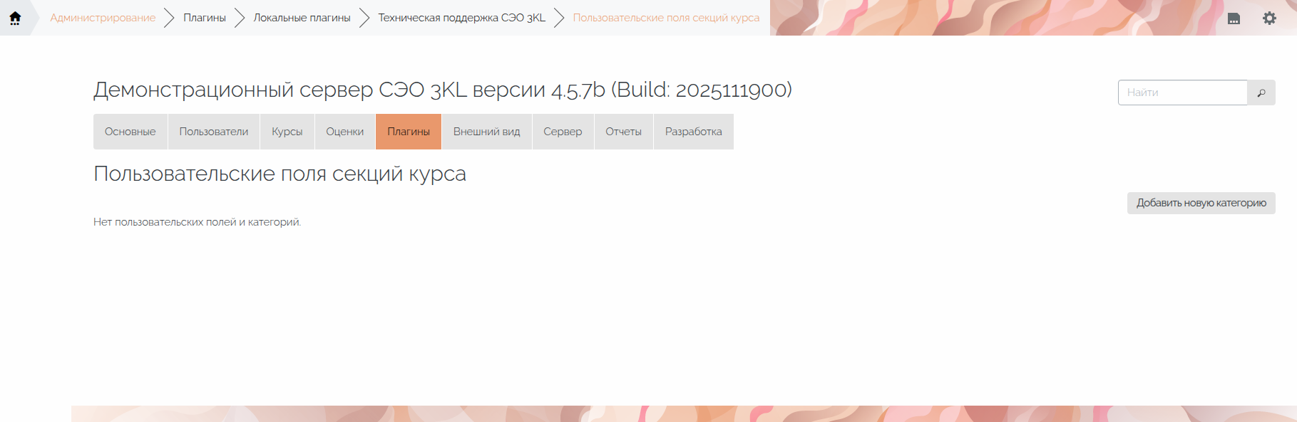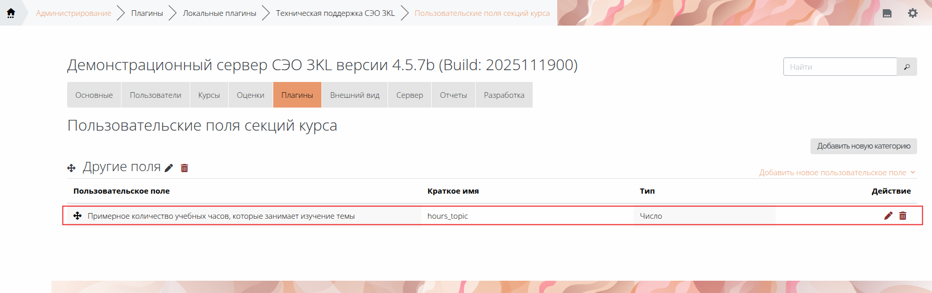 Страница расположена по пути Администрирование->Плагины->Локальные плагины->Техническая поддержка СЭО 3KL->Пользовательские поля секций курса (Рис. 3.5.1).