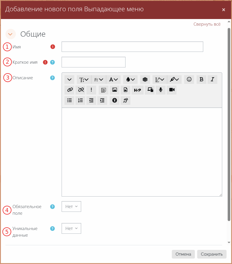 У полей всех типов есть общие и специфические настройки. Общие настройки располагаются в секции «Общие» и состоят из: