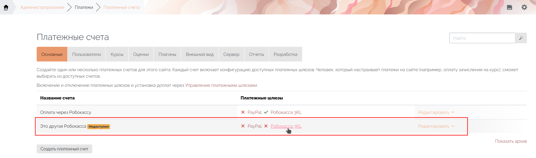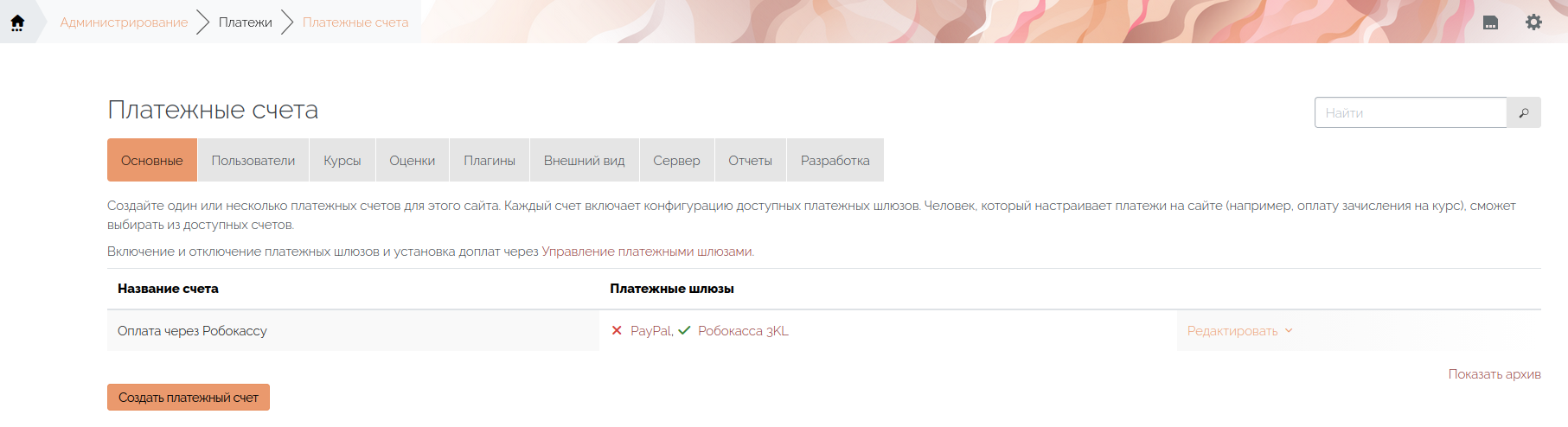 Функционал платежных счетов предоставляет пользователям возможность совершать платежи через настроенные в системе платежные шлюзы (специальные плагины банков, платежных систем или сервисов) и используется, в первую очередь, для платных способов зачисления на курсы.