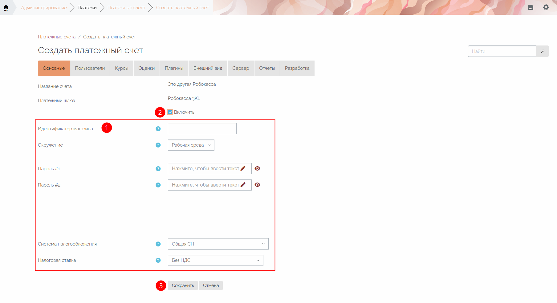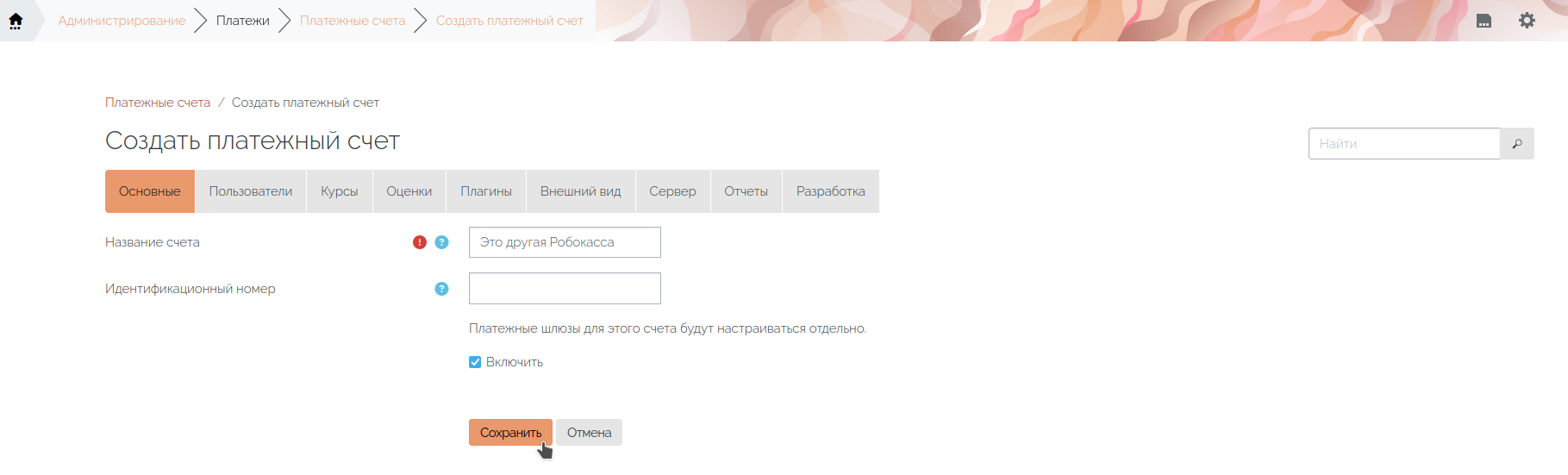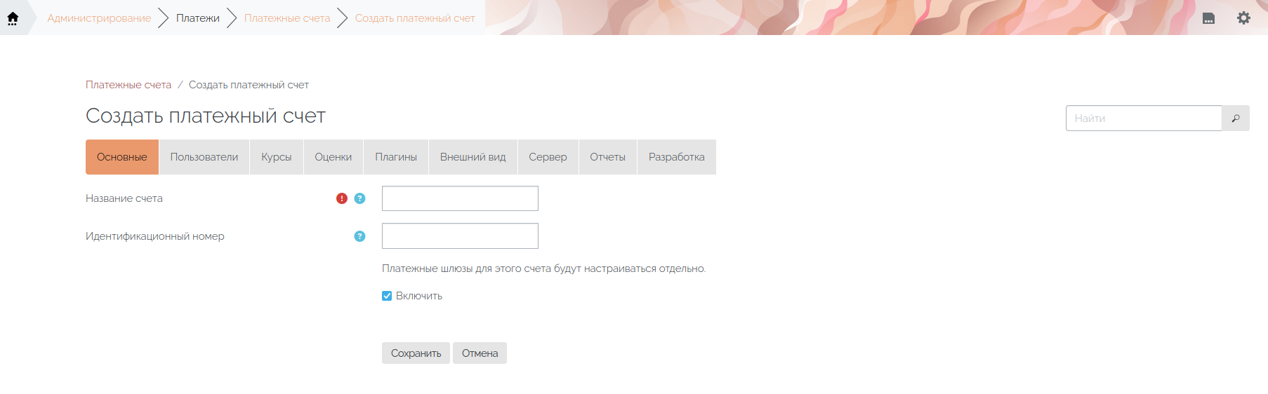 - Название счета. Название, которое будет отображаться для этого платежного счета в интерфейсах системы (например, то, что будет видеть преподаватель при настройке платного зачисления на курс и выборе оплаты через платежный шлюз).