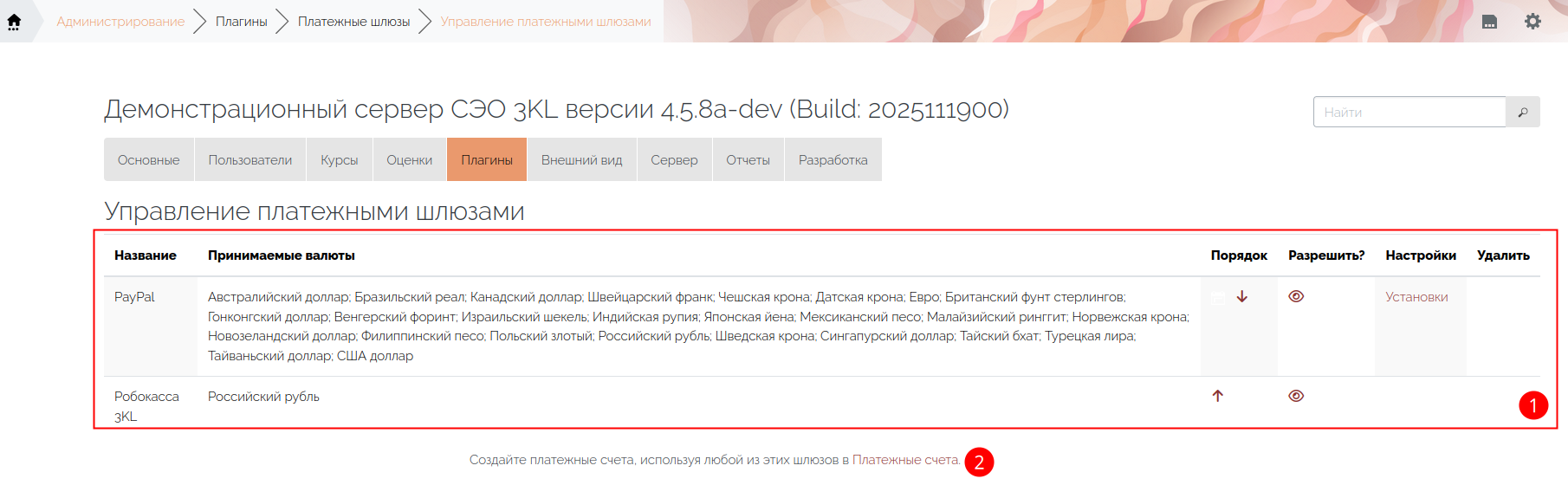 | Удалить | Возможность удаления плагина платежного шлюза из графического интерфейса в текущей версии СЭО 3KL не реализована. |
