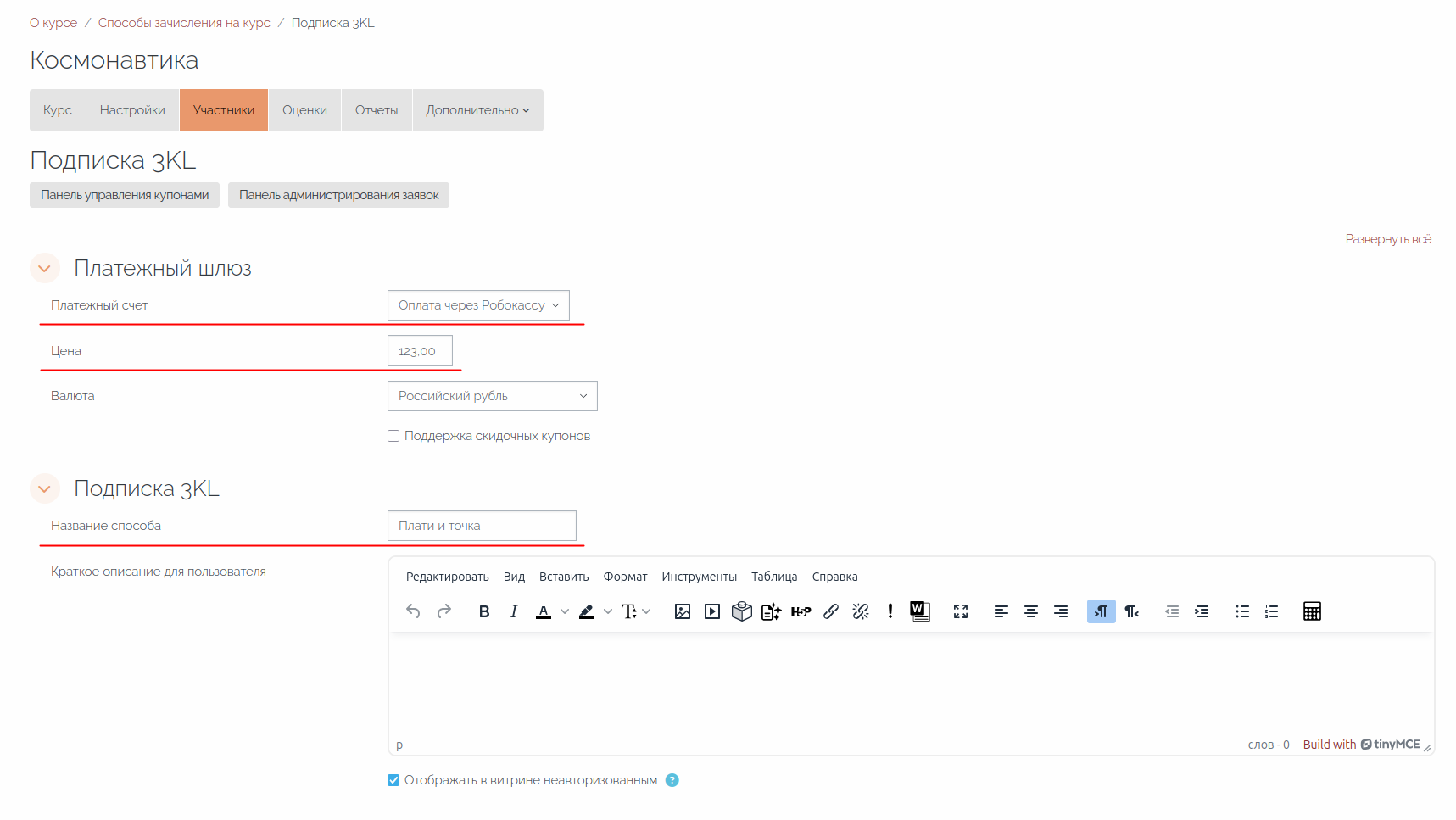 1) Преподаватель настраивает платное зачисление на курс: добавляет способ зачисления «Подписка 3KL» (Рис. 2.2.1), указывает в нем способ оплаты «Платежный шлюз» (Рис. 2.2.2), выбирает нужный платежный счет, задает стоимость подписки и название для способа зачисления (Рис. 2.2.3).