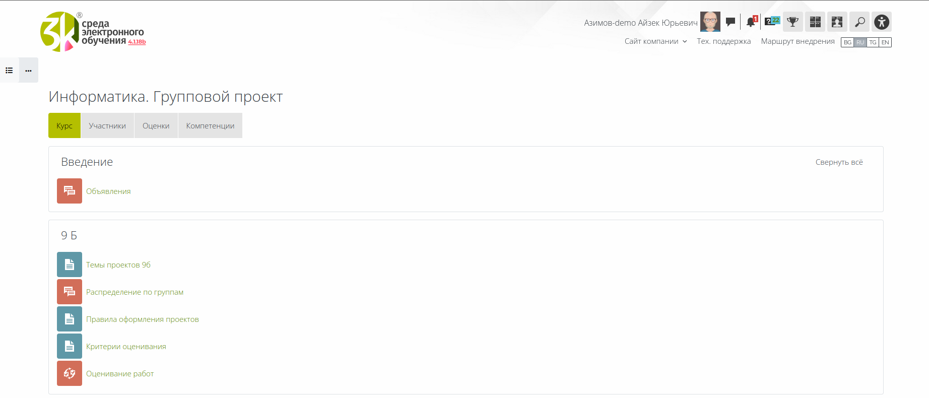В курсе «Информатика. Групповой проект» пользователю будет доступна только секция, соответствующая его классу (Рис. 4.2).