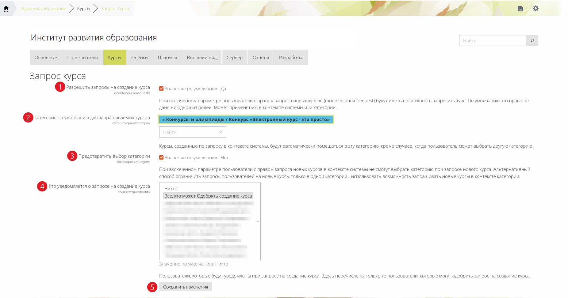 - Кто уведомляется о запросе на создание курса = Все, кто может Одобрять создание курса (поз. 4 1).