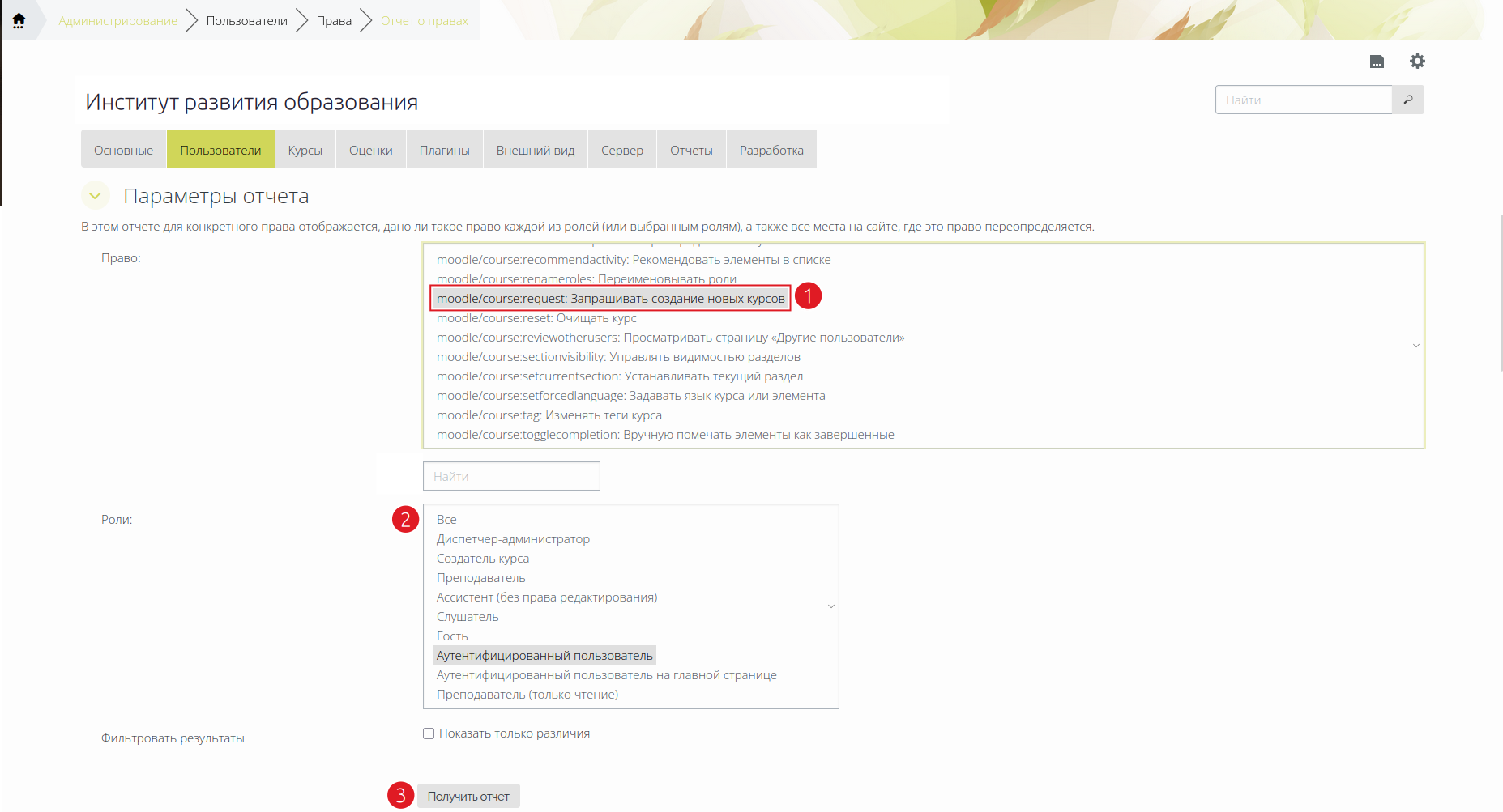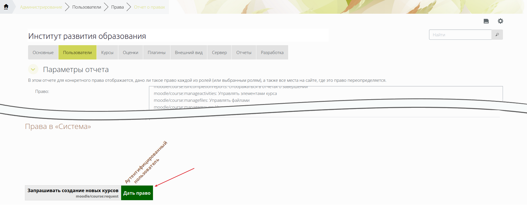 2) Так как после регистрации на платформе конкурсанты будут иметь роль «Аутентифицированный пользователь», администратору необходимо убедиться, что у роли «Аутентифицированный пользователь» есть право «Запрашивать создание новых курсов» (moodle/course:request). Для этого на странице «Отчет о правах» (Администрирование —> Пользователи—>Права —> Отчет о правах)