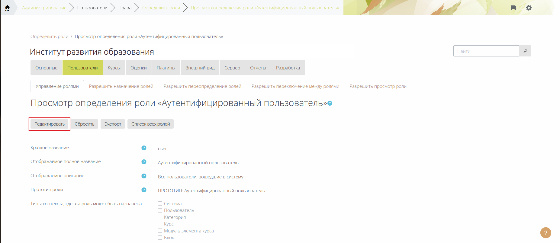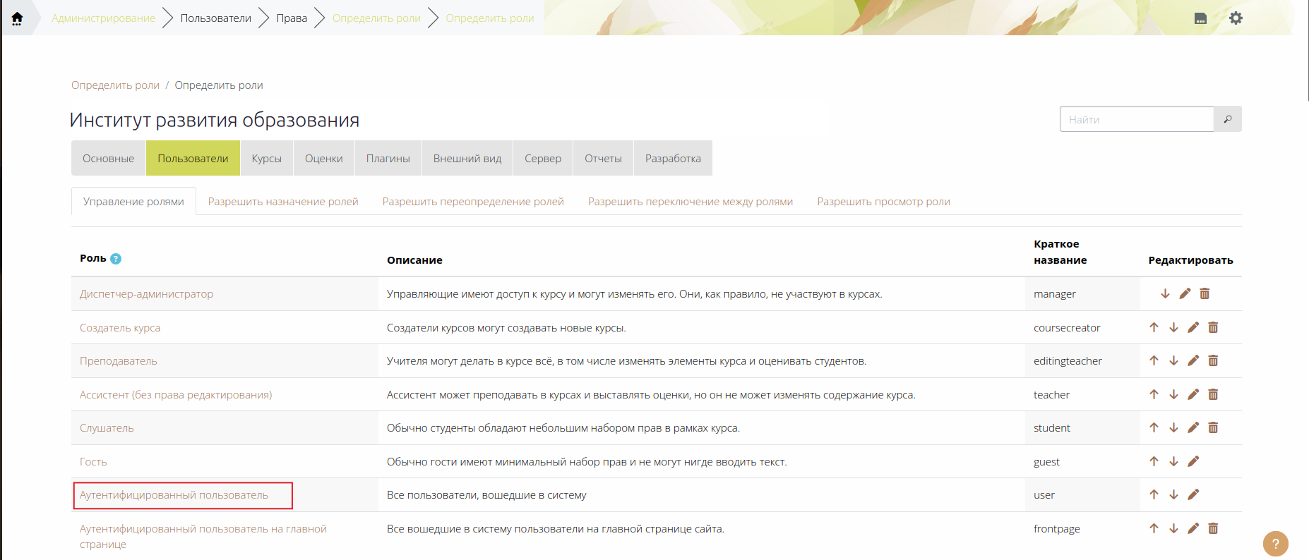 3) Если у роли «Аутентифицированный пользователь» отсутствует право «Запрашивать создание новых курсов» (moodle/course:request), его нужно дать. Для этого на странице «Определить роли» (Администрирование —>Пользователи —>Права —>Определить роли —>Определить роли) нажать на роль «Аутентифицированный пользователь» (Рис. 4).