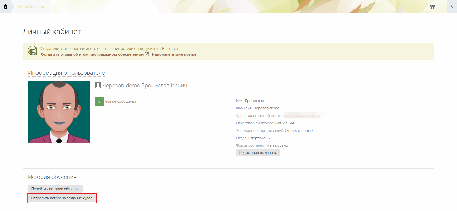 3) В блоке «История обучения 3KL» видит кнопку «Отправить запрос на создание курса» (Рис. 7) и нажимает на нее.