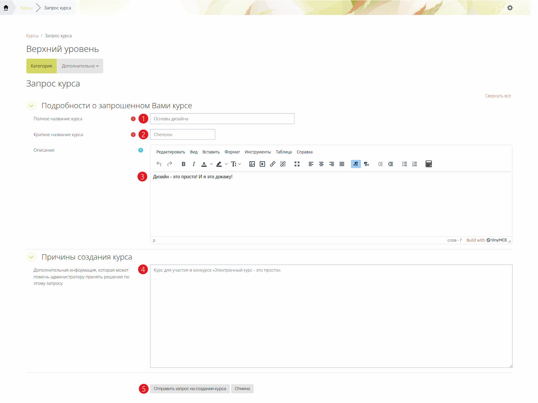 5) Нажимает кнопку «Отправить запрос на создание курса» (см. поз. 5 Рис. 8).