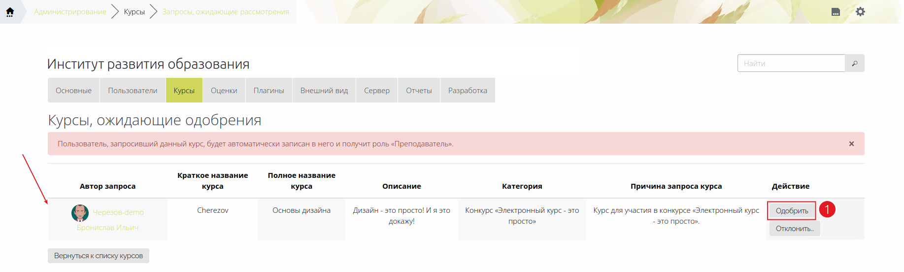 1) Администратор, ответственный за отслеживание запросов курсов, переходит на страницу «Курсы, ожидающие одобрения» (Администрирование —>Курсы —>Запросы, ожидающие рассмотрения).