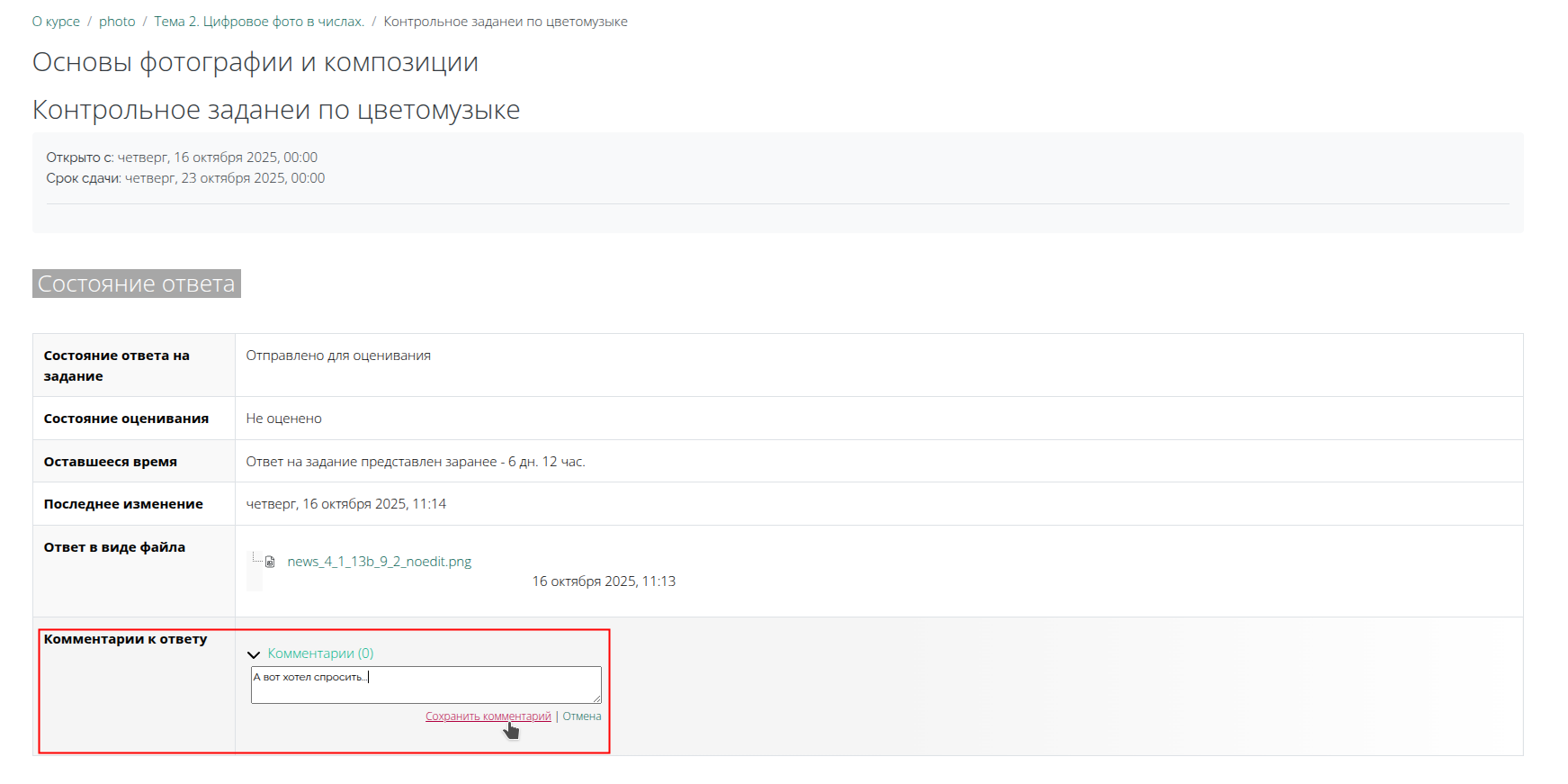 После отправки ответа у слушателя на основной странице элемента курса появляется дополнительный интерфейс коммуникации с преподавателем — диалоговое поле «Комментарии» (Рис. 3.3.3).