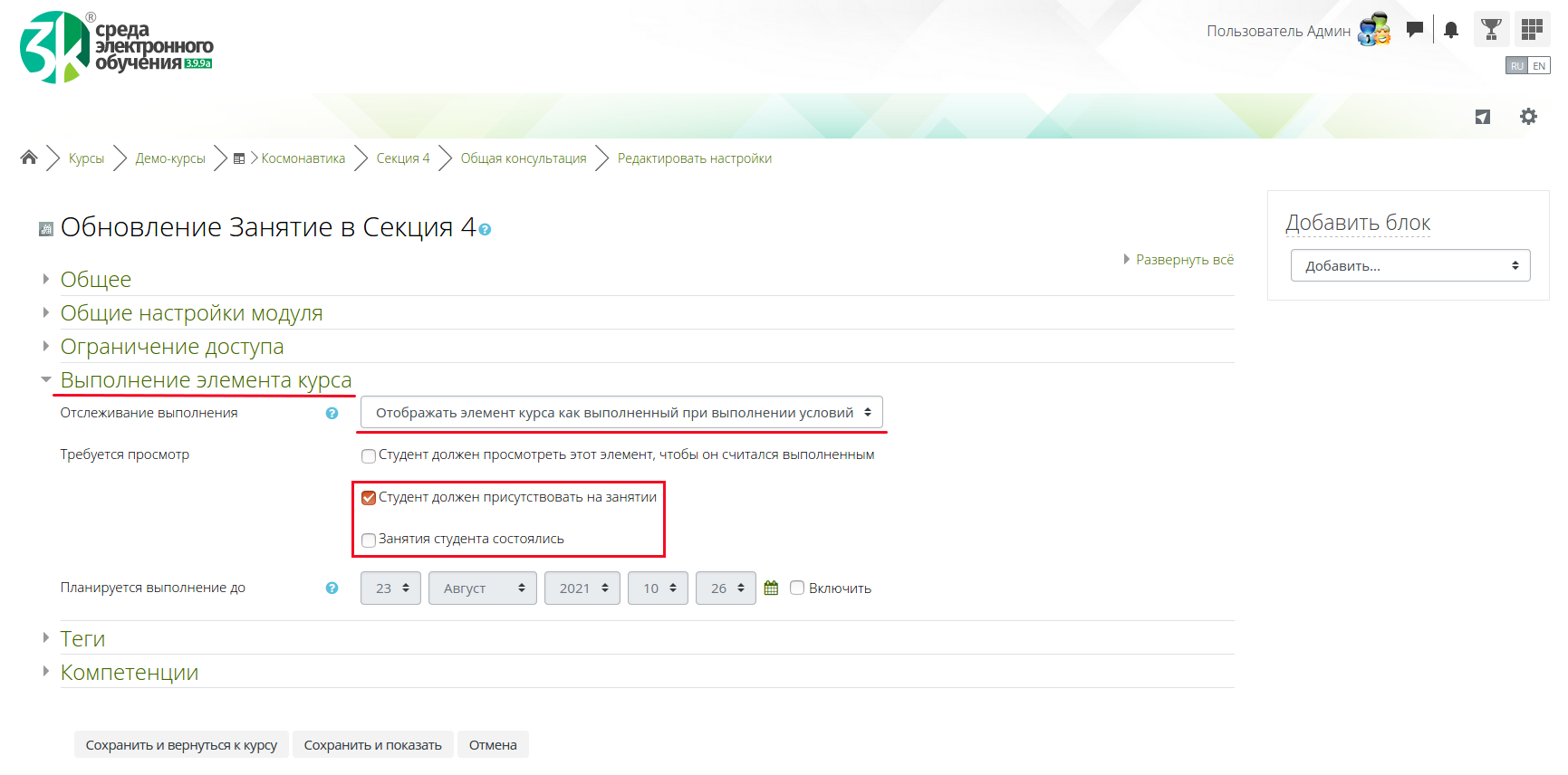 В настройках элемента «Занятие» добавлены новые параметры, определяющие, при каких условиях элемент считается выполненным.