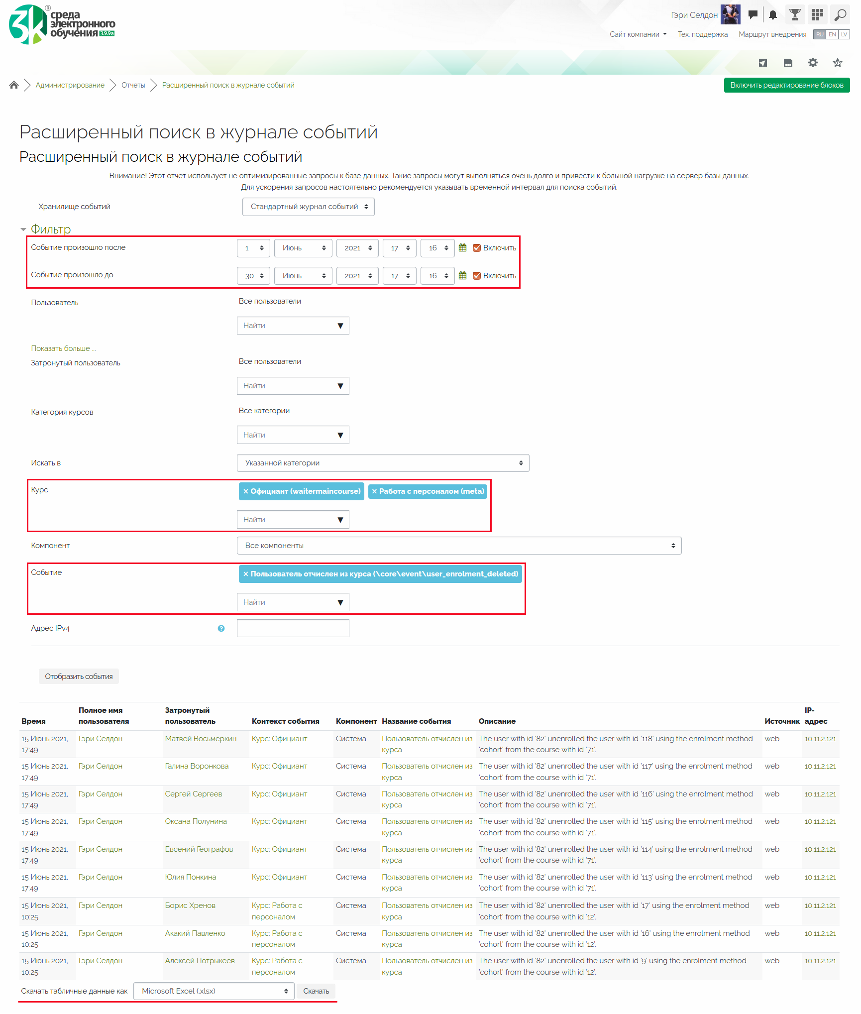 Методисту учебного центра для отчета требуется информация о пользователях, отчисленных из курсов в течение прошедшего месяца. Раньше обработка данных Журнала событий отнимала много времени, так как информация в таблице избыточна, а более «тонкая» фильтрация не предусмотрена. Теперь, используя возможности нового плагина, можно ограничить выгружаемые данные и настроить: начальную и конечную дату формирования выгрузки; перечень курсов; указать конкретное событие в системе (Пользователь отчислен из курса), которое необходимо выгружать.
