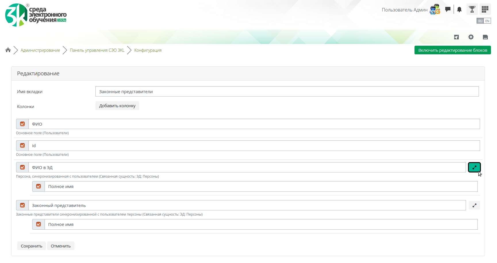 В «Панели управления СЭО 3КL» стали доступны поля данных Электронного деканата и обновлен интерфейс страницы Конфигурация.