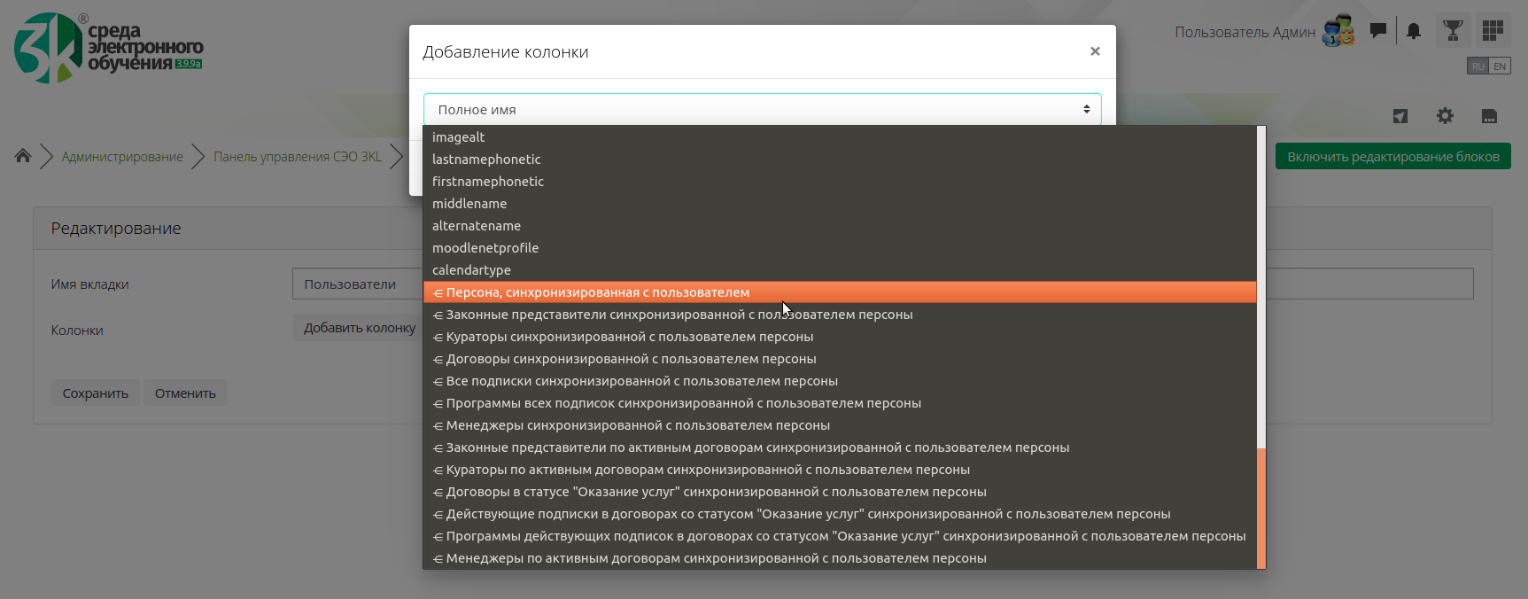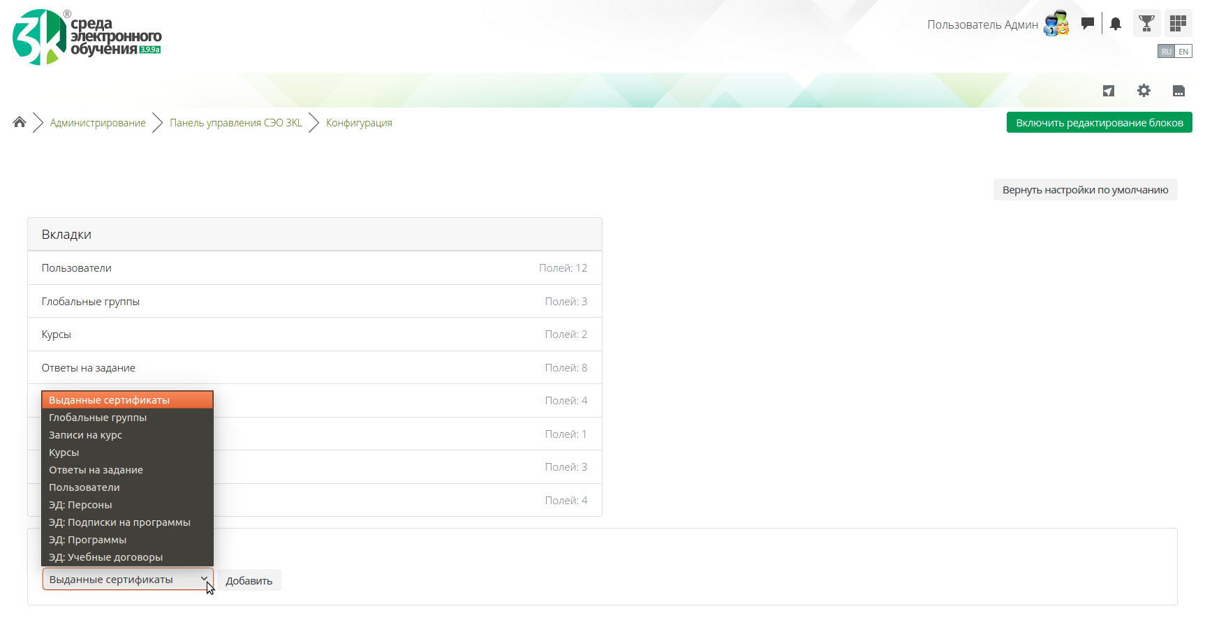 Новые доработки плагина «Панель управления СЭО 3КL». Обновленный интерфейс конфигуратора позволяет производить более удобное создание, настройку и редактирование вкладок. Добавлены новые шаблоны вкладок с данными Электронного деканата: Персоны, Подписки на программы, Программы, Учебные договоры. Для шаблона Пользователи стало доступно отображение связей пользователей с объектами ЭД. #3224