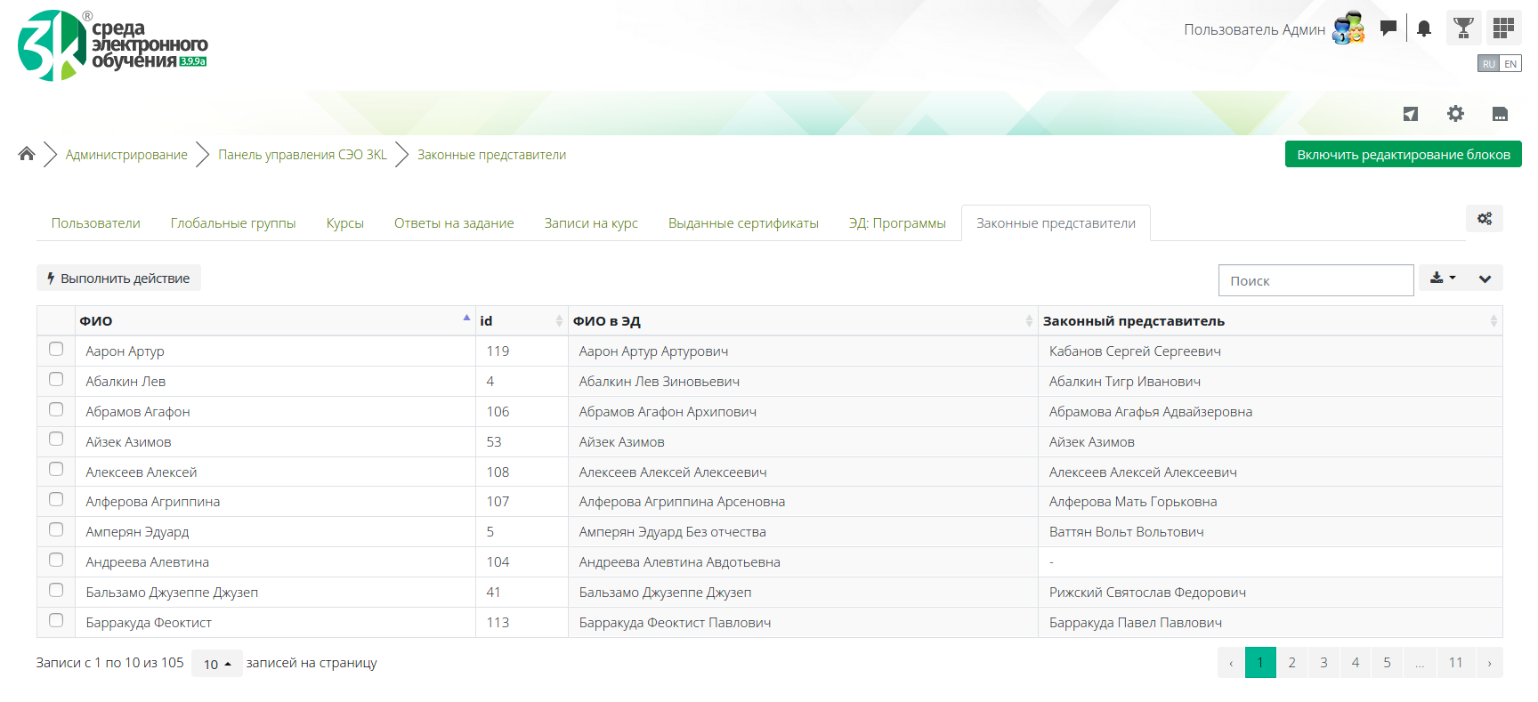 Администратору платформы электронного обучения колледжа необходимо сформировать список законных представителей учащихся, чтобы иметь возможность своевременно информировать их об изменениях в плане мероприятий «Программы воспитания и социализации». Используя шаблон Пользователи плагина «Панель управления СЭО 3КL» он настраивает его, используя доступную теперь связь с объектами Электронного деканата. В результате, на новой вкладке «Панели управления СЭО 3КL» формируется список учащихся и их законных представителей с необходимыми контактными данными, который можно сохранить в виде файла необходимого формата.