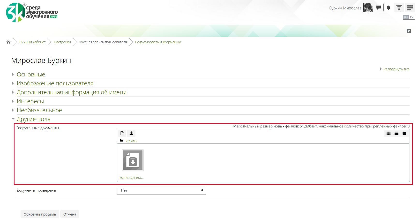 Центр ДПО, для доступа к дистанционным курсам повышения квалификации просит пользователей загрузить скан диплома о соответствующем образовании. Раньше это делалось через элемент «Задание» промежуточного курса и для просмотра документа требовалось зайти в соответствующий промежуточный курс. Благодаря новому элементу, при первой авторизации система требует загрузки данного документа в профиль, где он доступен пользователям с соответствующими правами.