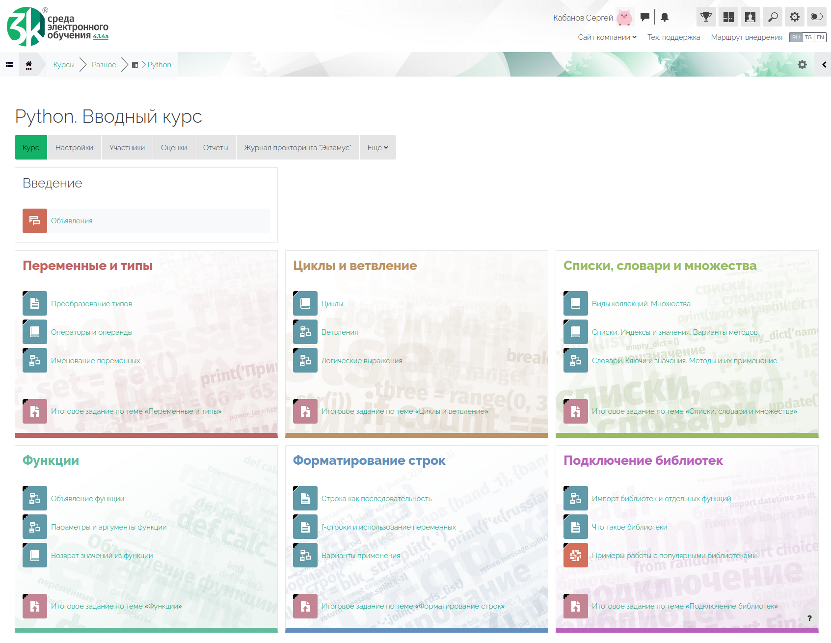 Преподаватель при создании курса программирования «Python. Вводный курс» планирует тематически группировать материалы в секциях учебного курса и оформлением дополнительно подчеркнуть это. Новые возможности кастомизации позволяют индивидуально стилизовать каждую секцию курса, используя тематическую подложку и настройки цвета для заголовка.