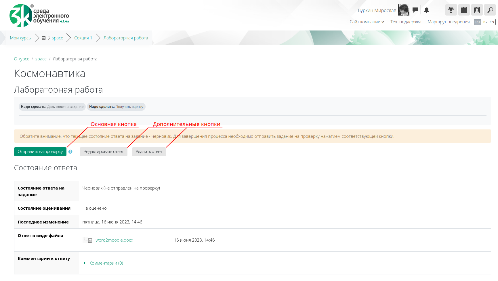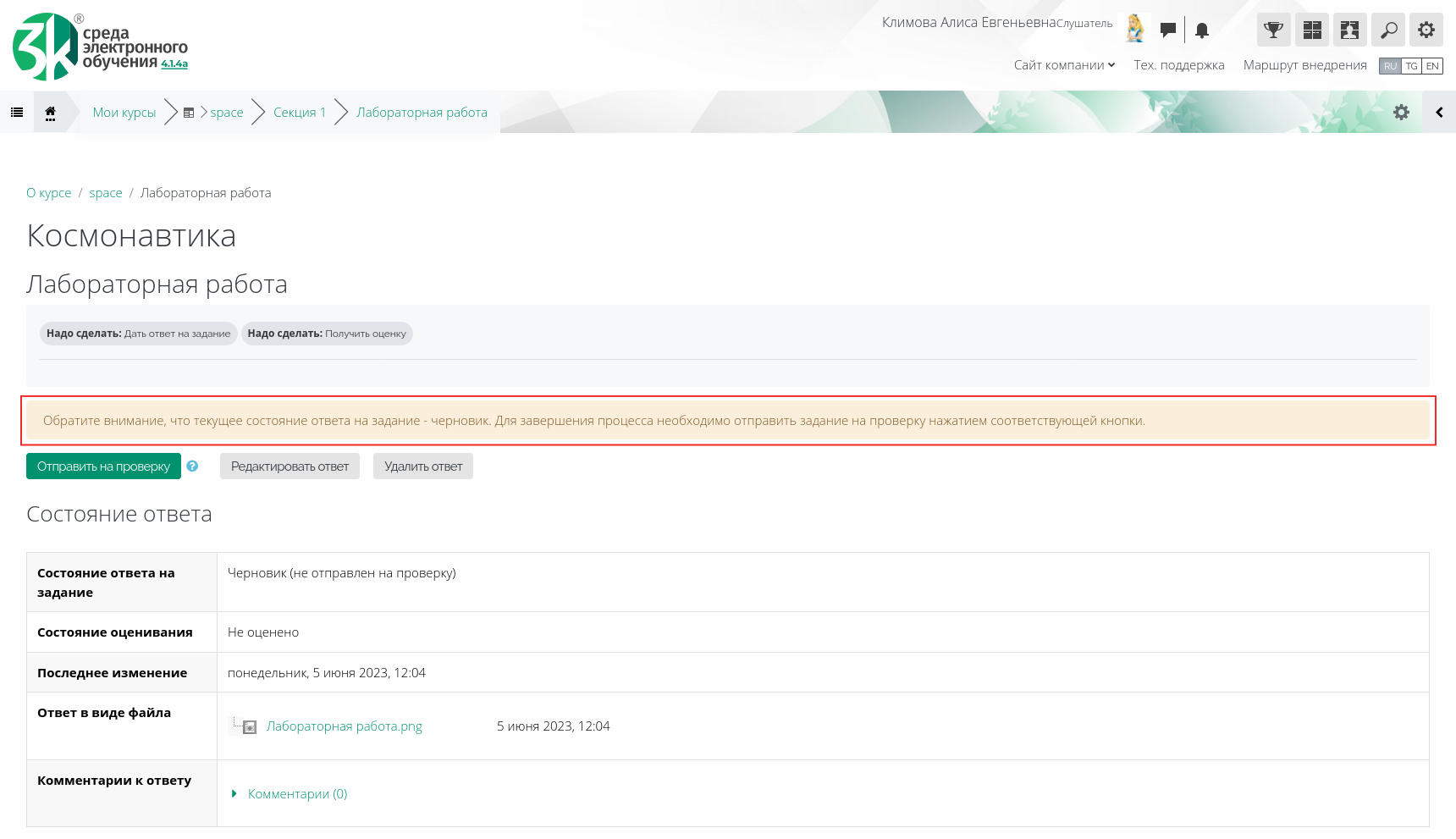 Студенты выполняют лабораторные работы по физике в элементе курса «Задание» в два этапа. Сначала они сохраняют черновик ответа на задание с первичными результатами эксперимента, а затем редактируют ответ, чтобы добавить в него обработанные данные. Ранее часть студентов забывала нажать на кнопку «Отправить на проверку», чтобы передать работу преподавателю. После обновления СЭО 3КL количество работ, не отправленных по ошибке, резко снизилось: новые настройки цвета кнопок интерфейса позволили привлечь внимание к кнопке отправки ответа, а появившееся уведомление о том, что ответ находится в статусе черновика, напоминает о необходимости предоставить ответ на проверку.
