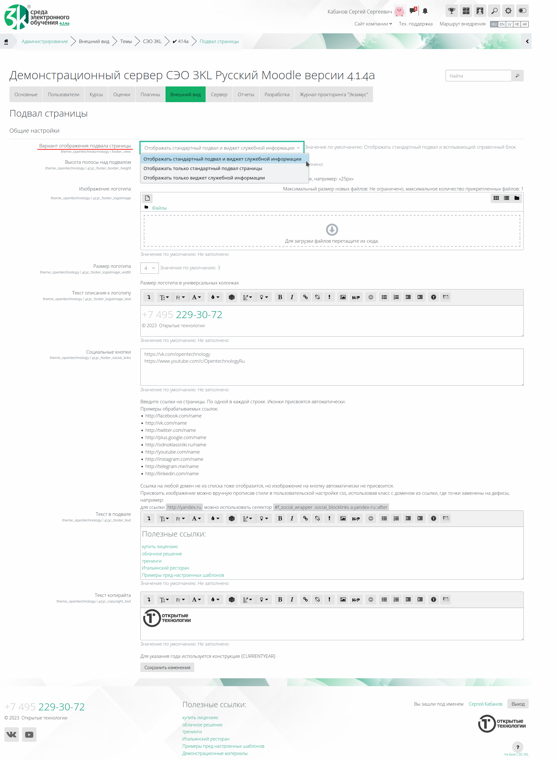 Область подвала на страницах корпоративной среды электронного обучения содержит много полезной информации. Большинство пользователей организации используют для доступа к порталу мобильные устройства и испытывают неудобство из-за того, что на маленьком экране подвал страницы занимает много места. Появившаяся после обновления возможность отключить подвал позволила улучшить навигацию по контенту, а все необходимые ссылки, размещенные в подвале, теперь доступны в виджете служебной информации.