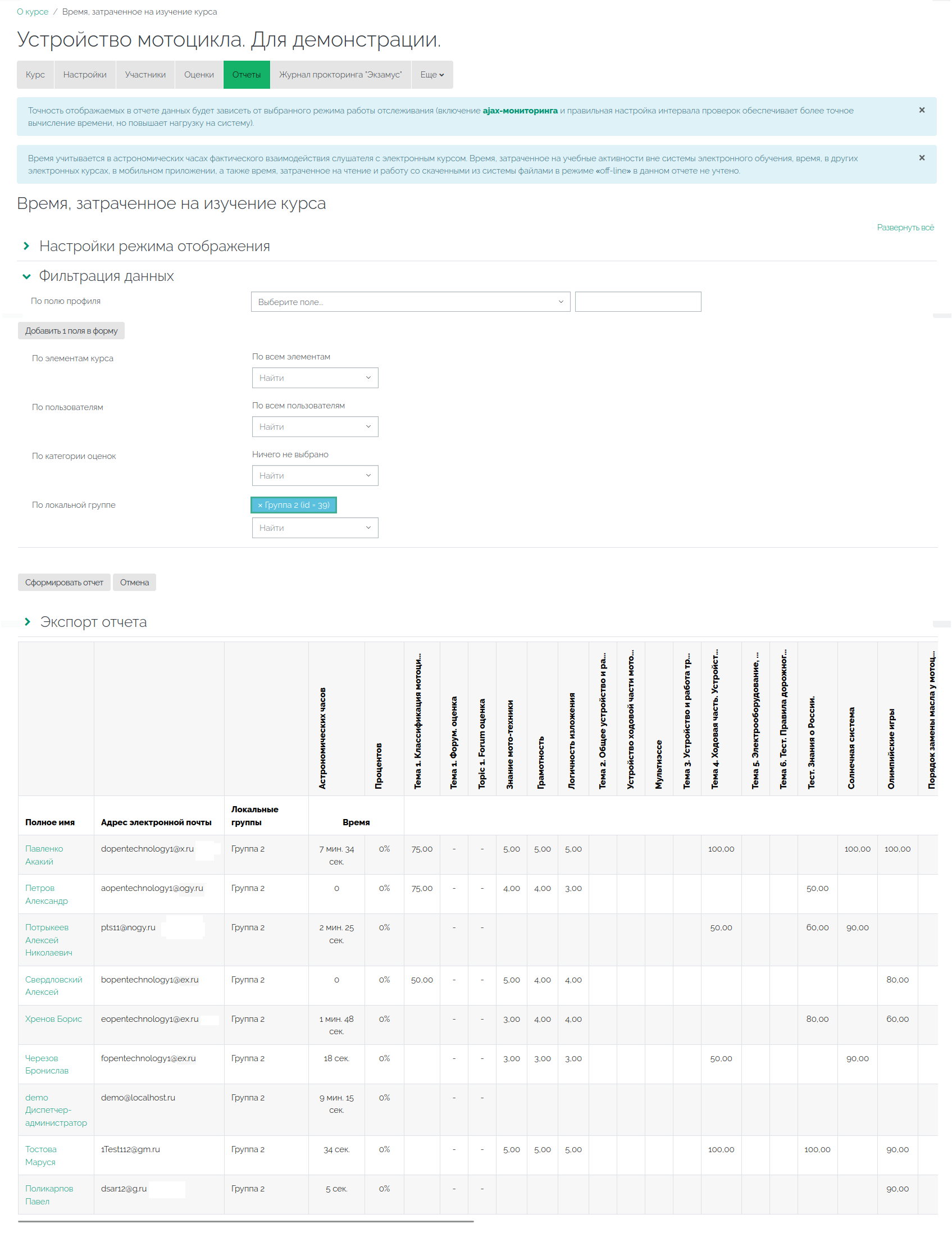 Все слушатели курса повышения квалификации часовых мастеров распределены в три локальные группы, у каждой группы свой преподаватель. При формировании отчета «Время, затраченное на изучение курса», каждому преподавателю приходилось прикладывать определенные усилия, чтобы очистить таблицу отчета от «лишних» пользователей и получить информацию только о своих слушателях. Новая возможность фильтрации по локальной группе значительно упростила процесс отбора слушателей одной группы для формирования отчета, а предустановленный шаблон для простого режима отображения сделал отчет еще более наглядным.