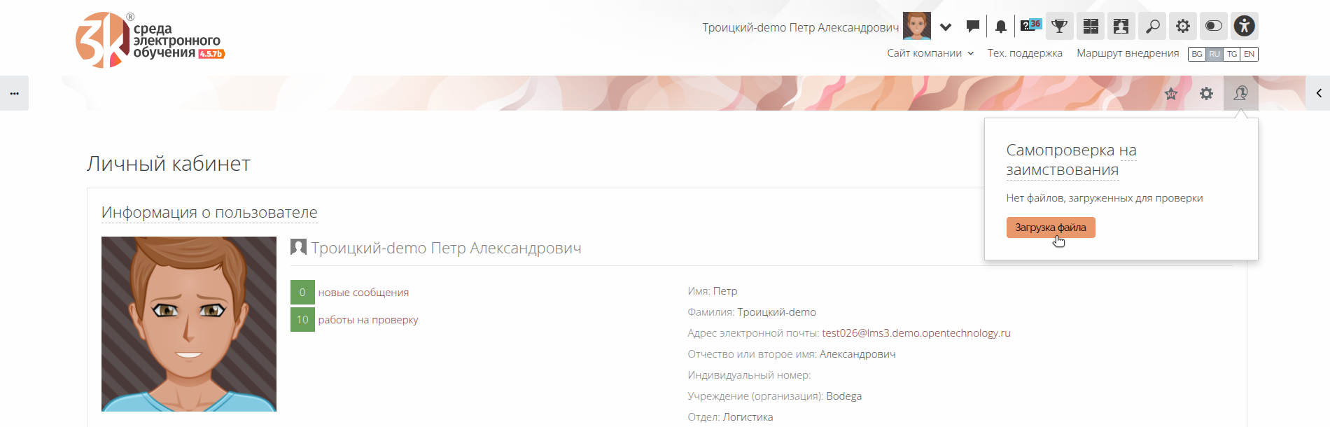 При помощи блока «Самопроверка на заимствования 3KL» слушатели могут выполнить самостоятельную проверку своих работ на оригинальность перед отправкой их преподавателю.