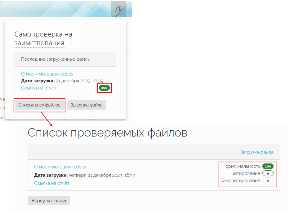 Слушатель загружает ответ на задание в виде текстового файла. После проверки работы сервисом, на странице задания ему отобразится информация об оригинальности загруженного ответа (Рис. 2.1.1).