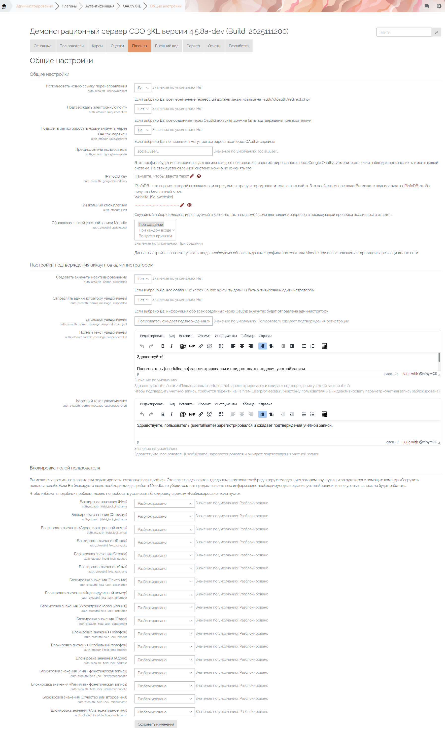 Для плагина «OAuth 3KL» доступны следующие интерфейсы с настройками: