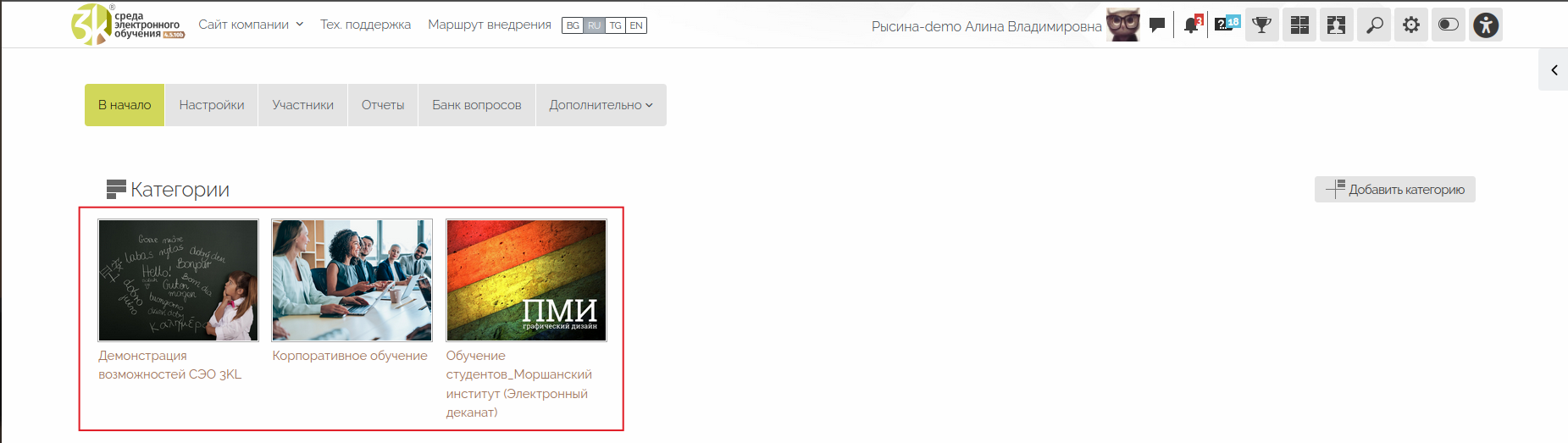 • формирование структуры среды дистанционного обучения: создание направлений и категорий;