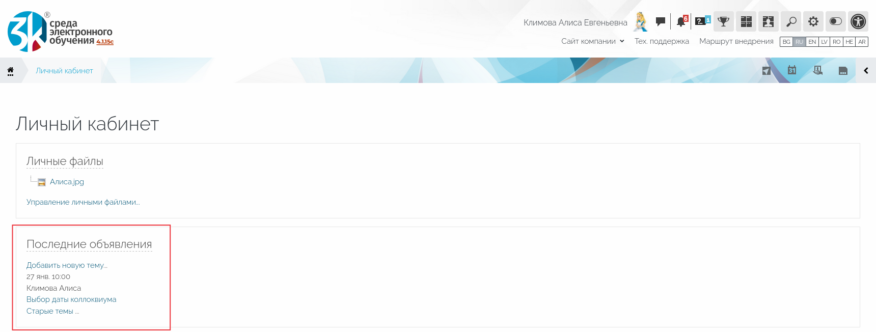 После этого блок появится снизу контентной области страницы Личного кабинета (Рис. 3.1.1.б).
