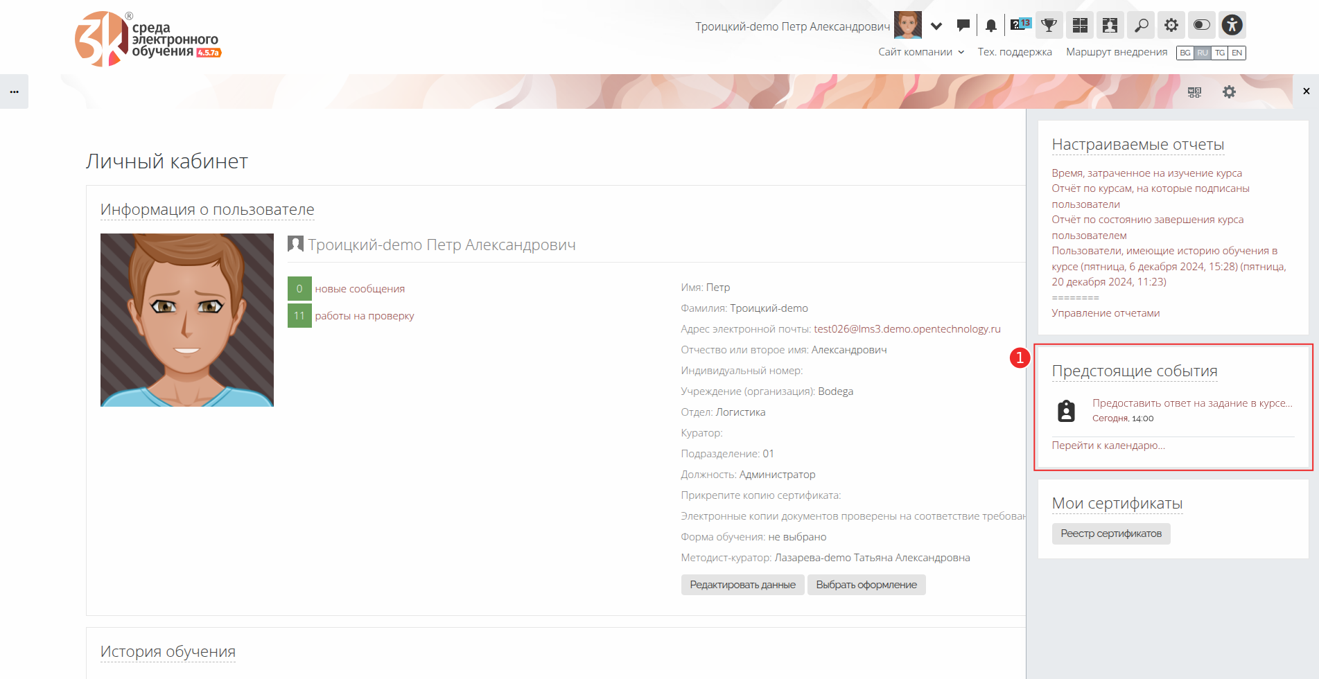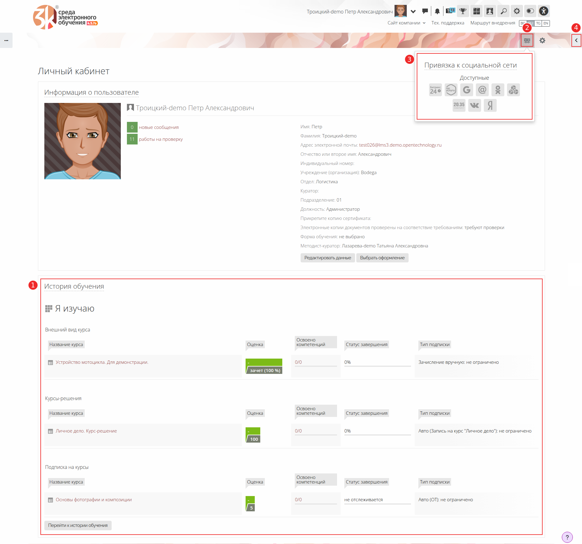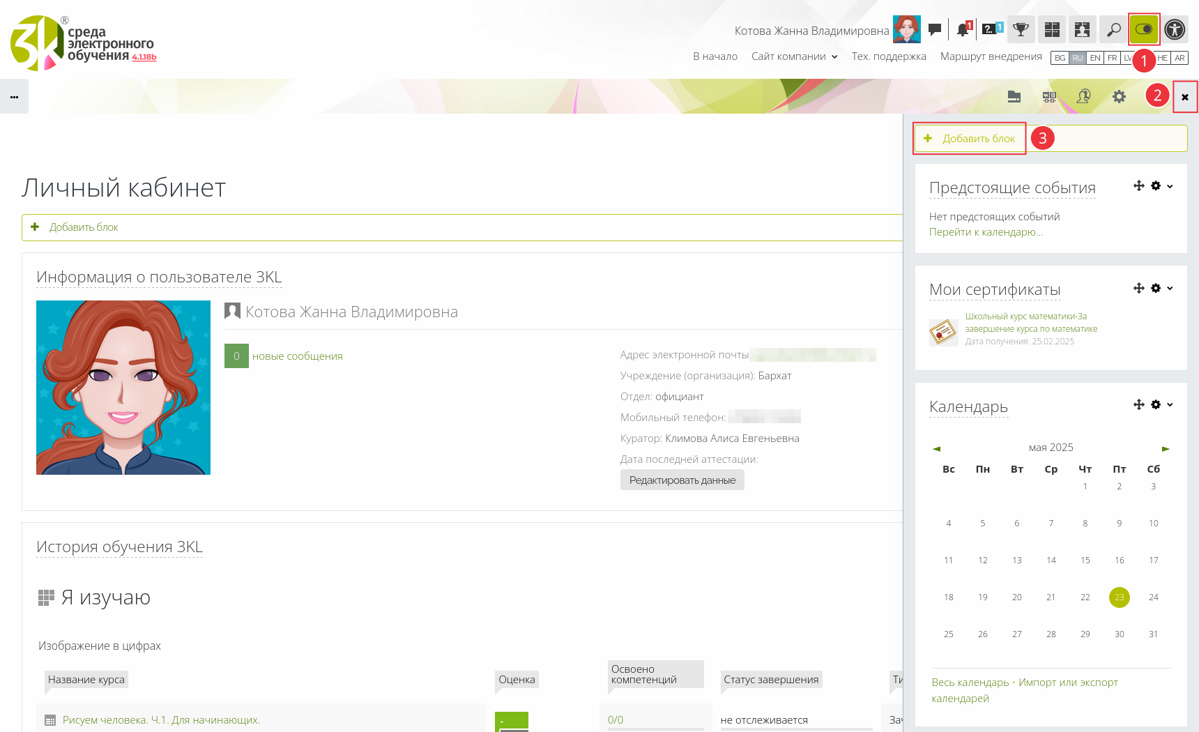 6.2. Быстрый доступ преподавателя к курсам в личном кабинете с помощью блока «История обучения 3KL»