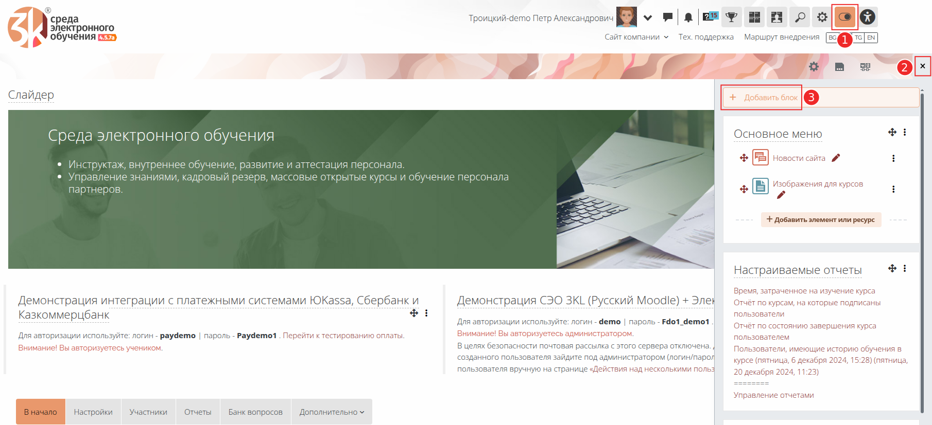Так администратор СЭО 3KL обладает правами по редактированию состава блоков на любой из страниц системы. Например, он может разместить блоки на главной странице сайта (Рис. 2.2.1). Для того, чтобы проверить, может ли пользователь добавлять блоки на текущую страницу, нужно включить на странице режим редактирования (поз. 1 Рис. 2.2.1) и раскрыть выдвижную панель блоков (поз. 2 Рис. 2.2.1). В выдвижной панели блоков должна отображаться кнопка «+ Добавить блок», позволяющая разместить экземпляр блока на странице.