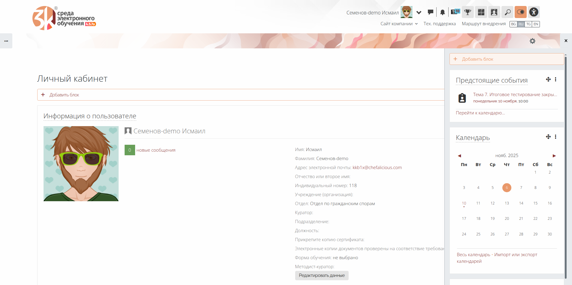 Каждый пользователь, зарегистрированный в СЭО 3KL, может редактировать состав блоков в своем Личном кабинете (Рис. 2.2.3).