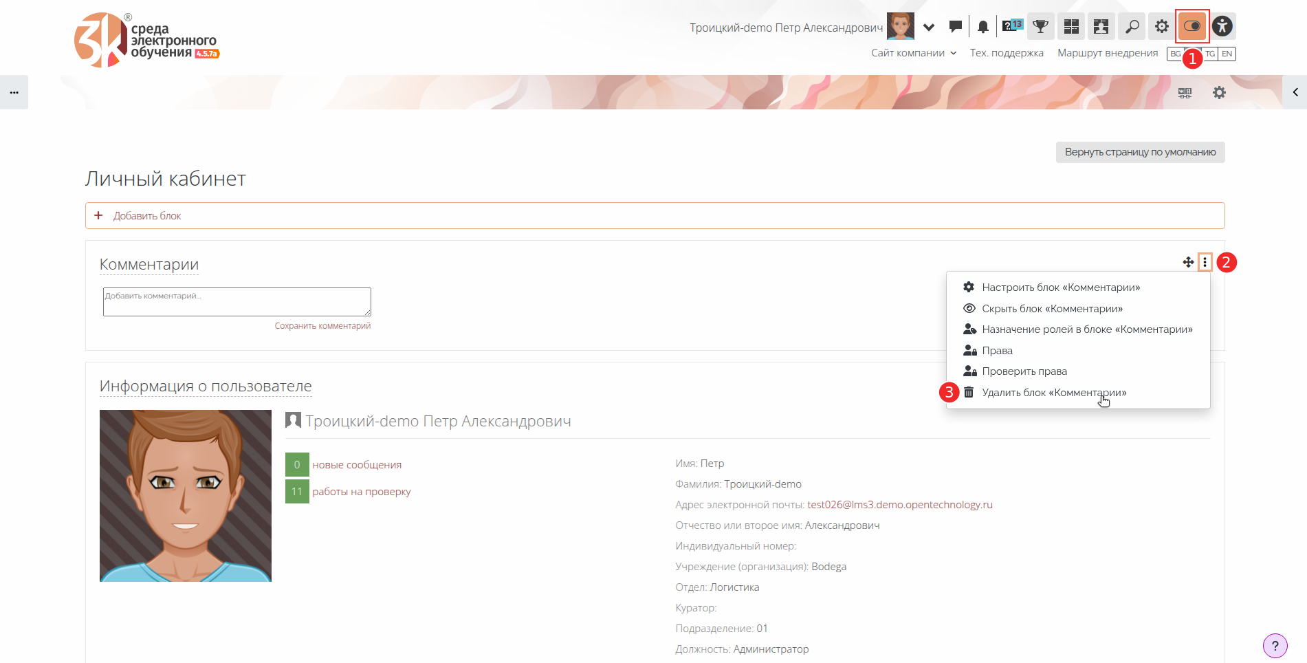 Размещенные на страницах СЭО 3KL экземпляры блоков можно при необходимости удалить. Для этого необходимо перейти в режим редактирования (поз. 1 Рис. 2.3.1), нажать на значок шестеренки рядом с названием нужного блока (поз. 2 Рис. 2.3.1) и выбрать опцию «Удалить блок» (поз. 3 Рис. 2.3.1). При этом будет удален только выбранный экземпляр блока, другие блоки такого же типа останутся на своих местах.