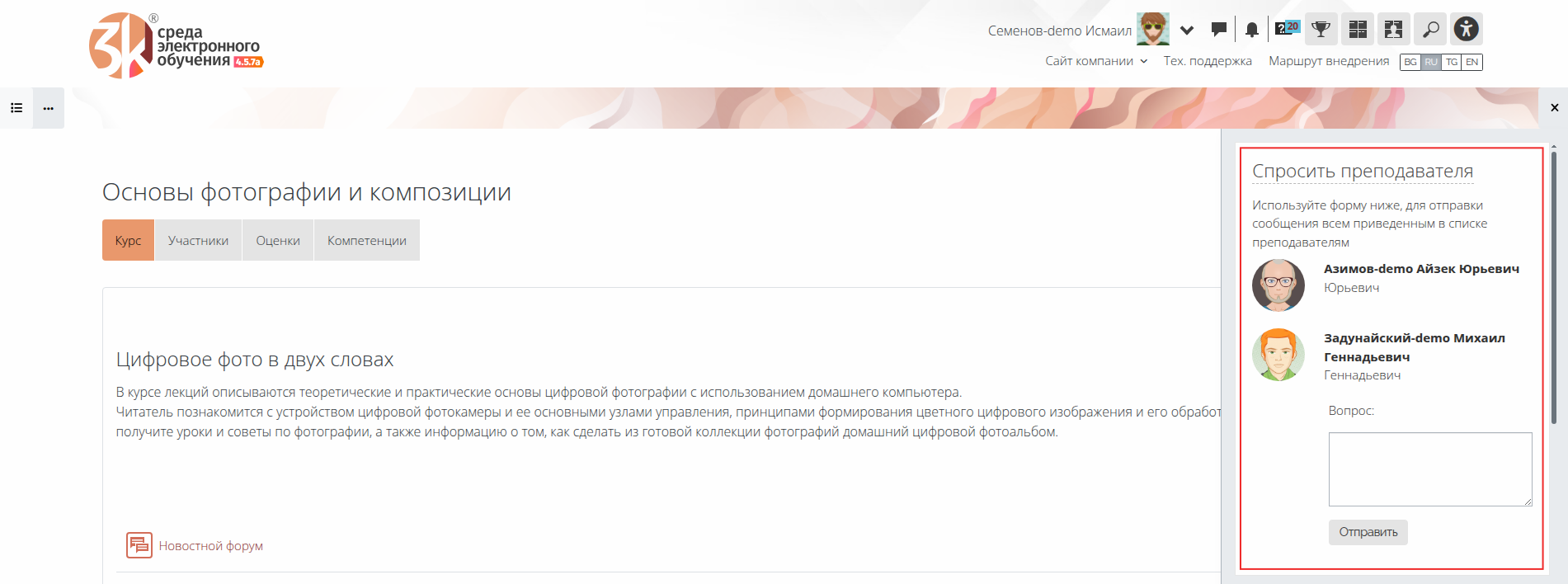 После выполненных преподавателем настроек пользователю с ролью «Слушатель» в выдвижной панели блоков курса будет отображаться блок «Спросить преподавателя 3KL» (Рис. 2.4.3), а пользователю с ролью «Вольный слушатель» выдвижная панель блоков отображаться не будет, т. к. блок «Спросить преподавателя 3KL» от него скрыт (Рис. 2.4.4).