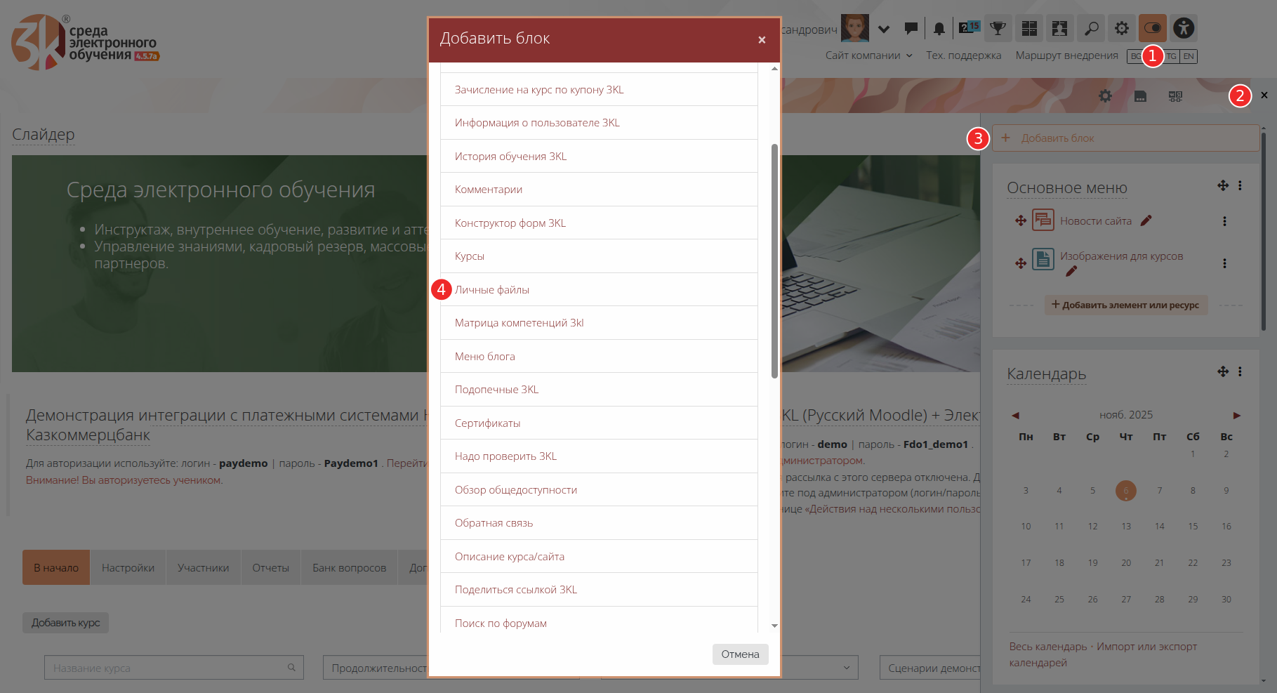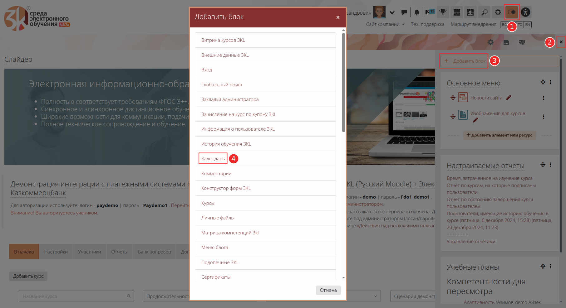 Пользователь, обладающий правами администратора в СЭО 3KL, может добавлять блок на любую страницу СЭО 3KL, в том числе и на главную страницу. Для того, чтобы добавить новый блок на главную страницу, администратору нужно сначала включить режим редактирования (поз. 1 Рис. 3.1.3.а), затем раскрыть выдвижную панель блоков (поз. 2 Рис. 3.1.3.а), нажать на кнопку «+ Добавить блок» (поз. 3 Рис. 3.1.3.а) и выбрать нужный блок в появившемся всплывающем окне (поз. 4 Рис. 3.1.3.а).