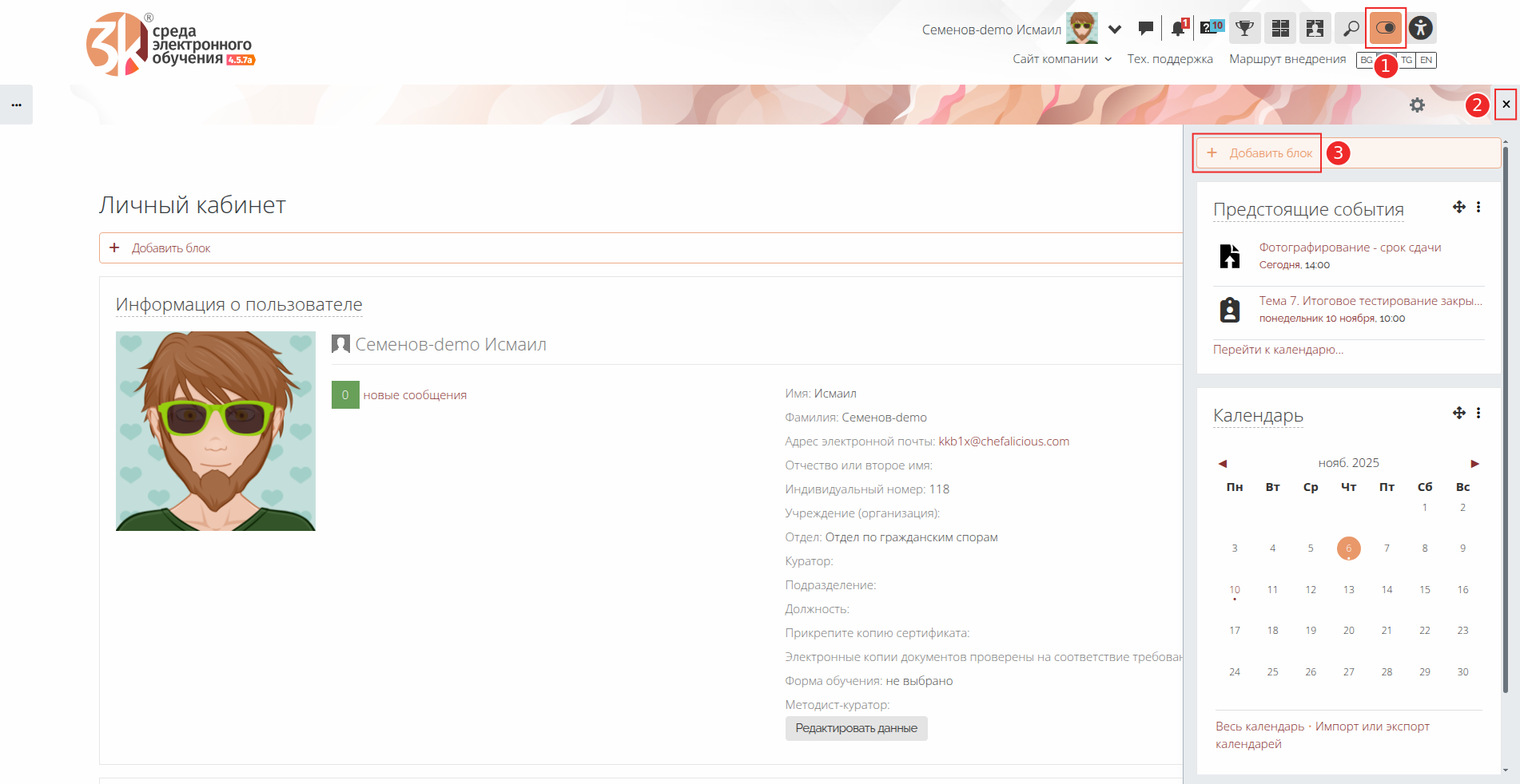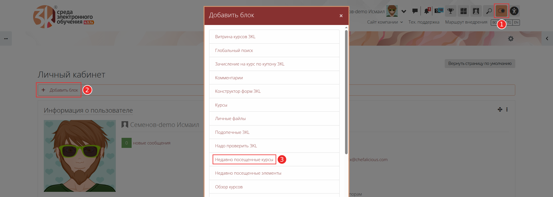 Любой зарегистрированный в СЭО 3KL пользователь по умолчанию обладает правом редактировать состав блоков в своем Личном кабинете. Для того, чтобы добавить новый блок в контентную область Личного кабинета, пользователь должен включить режим редактирования (поз. 1 Рис. 3.1.1.а), нажать на кнопку «+ Добавить блок» (поз. 2 Рис. 3.1.1.а) и в появившемся всплывающем окне выбрать нужный блок (поз. 3 Рис. 3.1.1.а).
