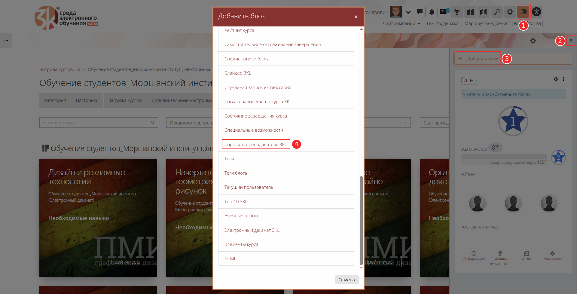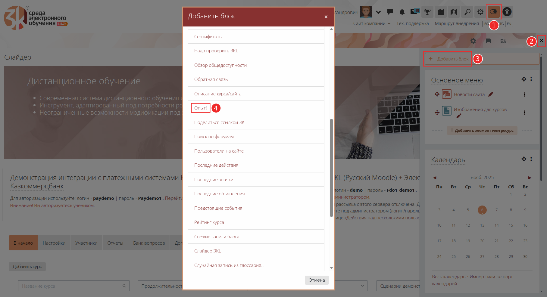 Администратор СЭО 3KL может добавить блок сразу во все курсы системы. Для этого ему нужно сначала добавить блок на главную страницу сайта. Чтобы добавить блок, нужно на главной странице сайта включить режим редактирования (поз. 1 Рис. 3.1.5.а), раскрыть выдвижную панель блоков (поз. 2 Рис. 3.1.5.а), нажать на кнопку «+ Добавить блок» (поз. 3 Рис. 3.1.5.а) и выбрать блок, который нужно разместить (в примере это блок «Опыт!» (поз. 4 Рис. 3.1.5.а).