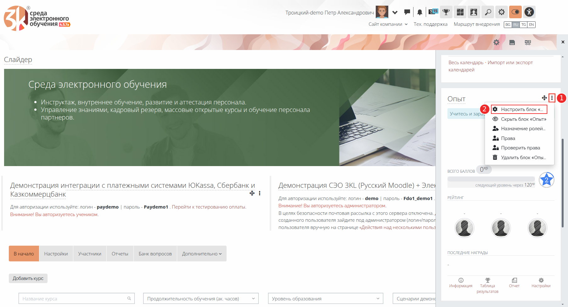 Далее нужно настроить расположение блока на всех страницах СЭО 3KL. Для этого нужно перейти к настройкам блока: нажать на кнопку шестеренки рядом с названием блока (поз. 1 Рис. 3.1.5.б) и выбрать опцию «Настроить блок «Опыт» (поз. 2 Рис. 3.1.5.б).