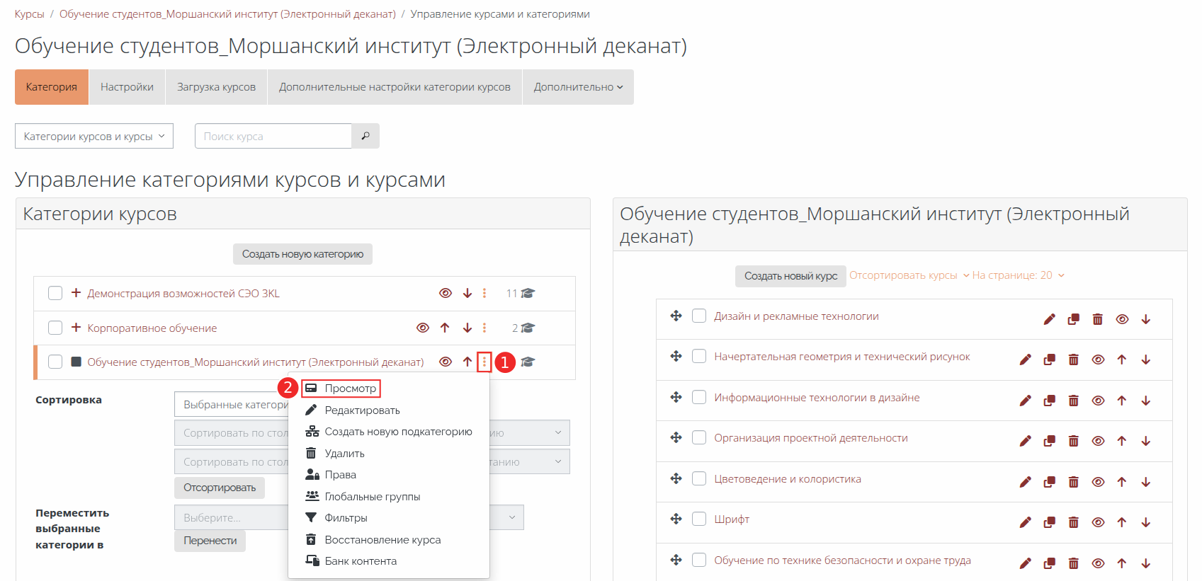 Администратор СЭО 3KL может добавить блок на страницы всех курсов определенной категории. Сделать это можно, добавив блок на страницу категории, расположенную на странице Витрины курсов 3KL. Чтобы перейти на эту страницу, нужно перейти по пути: Администрирование -> Курсы -> Управление курсами и категориями (Рис. 3.1.6). На открывшейся странице необходимо перейти к странице просмотра категории. Для этого нужно нажать на кнопку шестеренки в строке с названием категории (в примере это категория «Обучение студентов_Моршанский институт (Электронный деканат)» - поз. 1 Рис. 3.1.6.а) и выбрать опцию «Просмотр» (поз. 2 Рис. 3.1.6.а).
