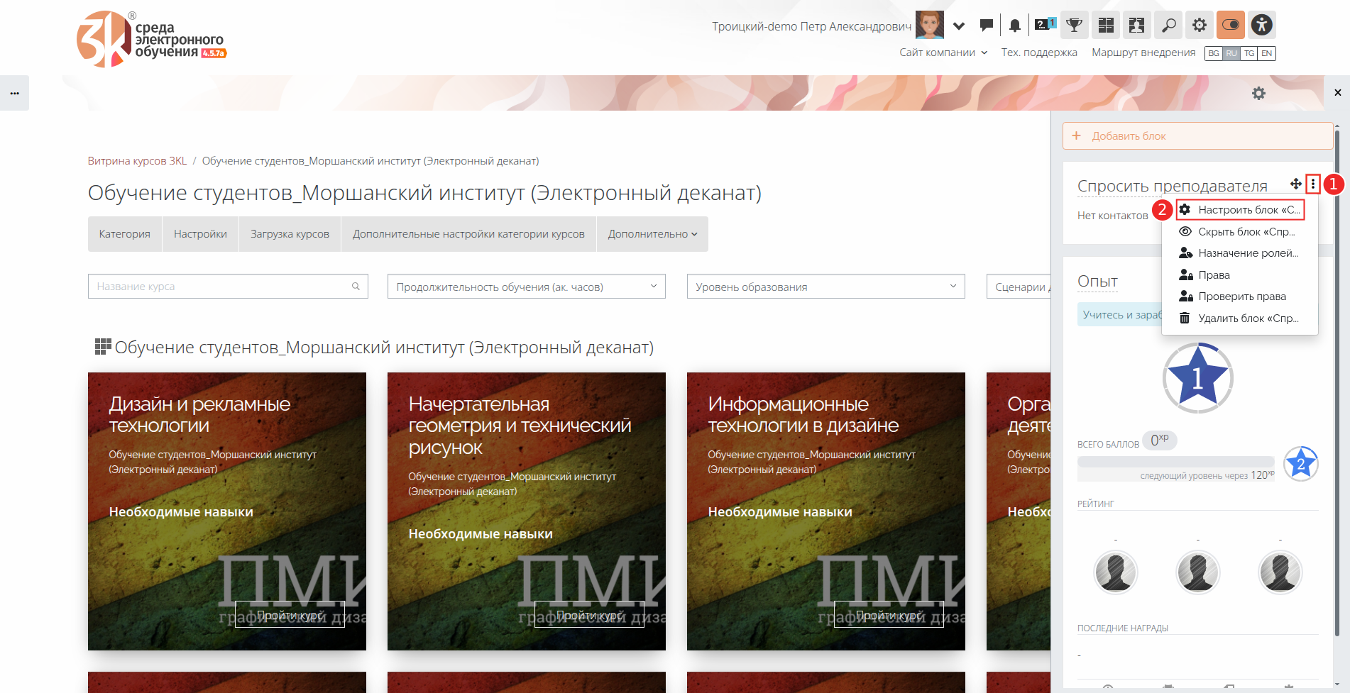 После добавление блока нужно настроить его расположение. Для этого нужно перейти к настройкам блока, нажав сначала на шестеренку рядом с названием блока (поз. 1 Рис. 3.1.6.в), затем выбрав опцию «Настроить блок «Спросить преподавателя 3KL» (поз. 2 Рис. 3.1.6.в).