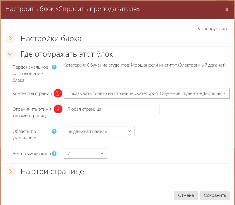 В настройке «Контексты страниц» (поз. 1 Рис. 3.1.6.г) нужно указать значение «Показывать на «Категория: Обучение студентов_Моршанский институт (Электронный деканат)» и любых подстраницах», в настройке «Ограничить этими типами страниц» – значение «Любая страница» (поз. 2 Рис. 3.1.6.г).