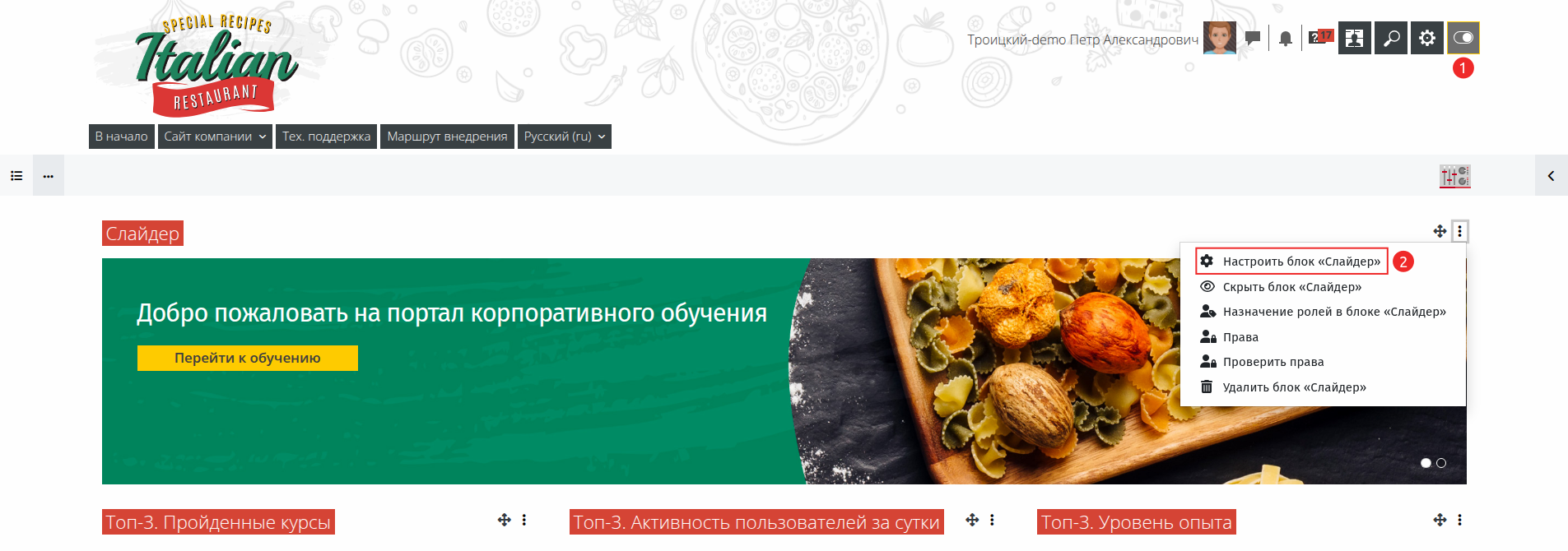2) На описательной странице курса перейти в режим редактирования (поз. 1 Рис. 5.2.2), раскрыть блок настроек Слайдера и выбрать опцию «Настроить блок «Слайдер 3KL» (поз. 2 Рис. 5.2.2).