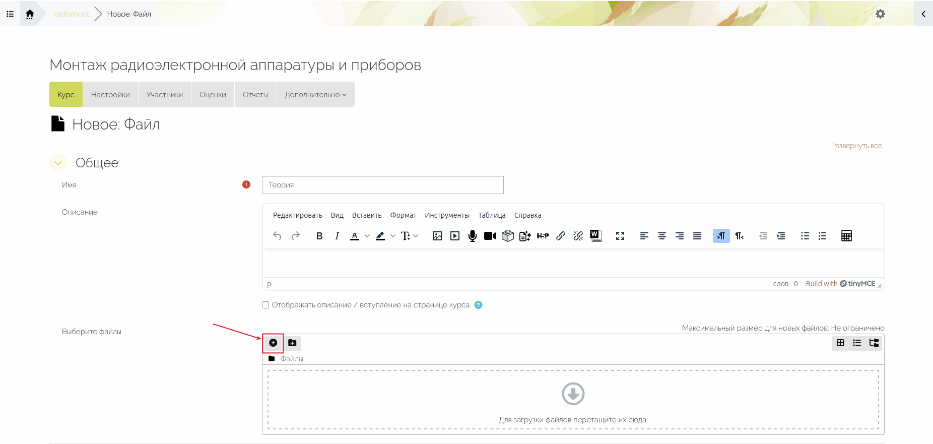 1) На странице настроек ресурса «Файл» в меню действий поля «Выберите файл» нужно нажать на кнопку «Добавить» (Рис. 5).