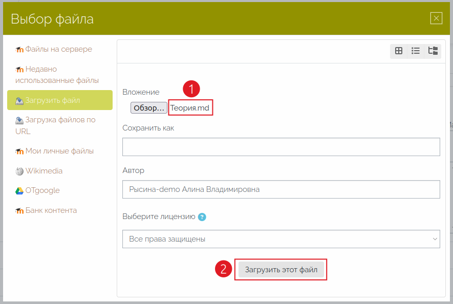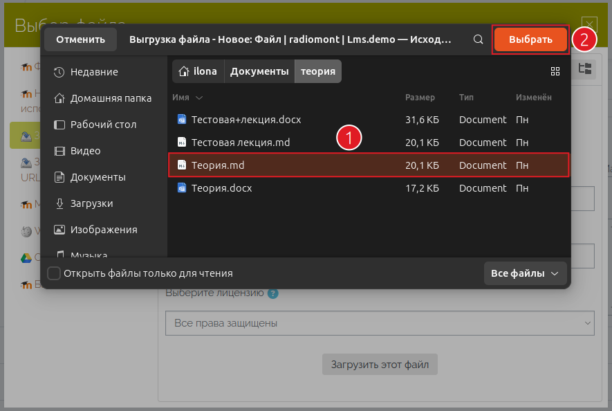2) Выбрать файл для загрузки. В открывшемся всплывающем окне нужно: