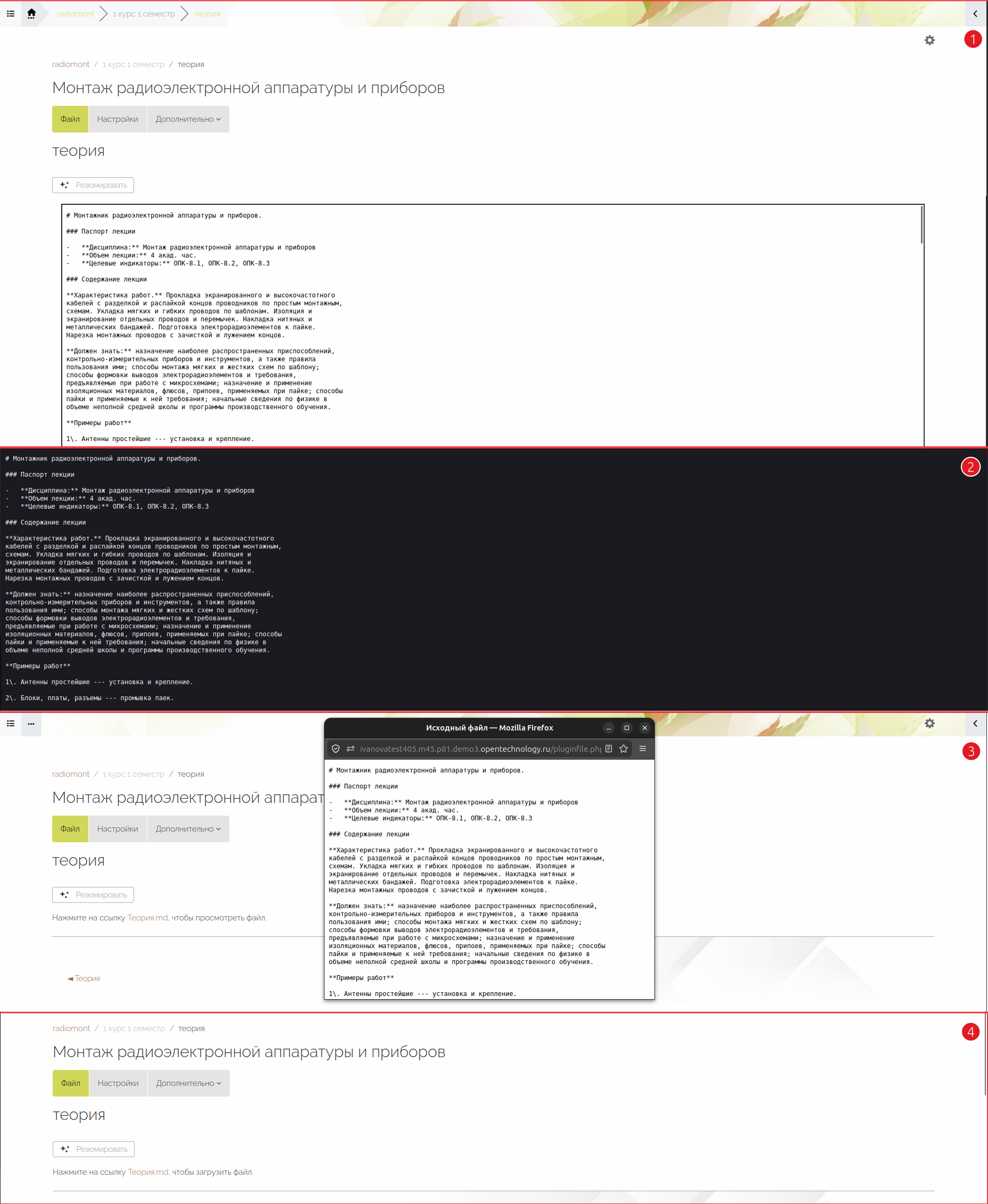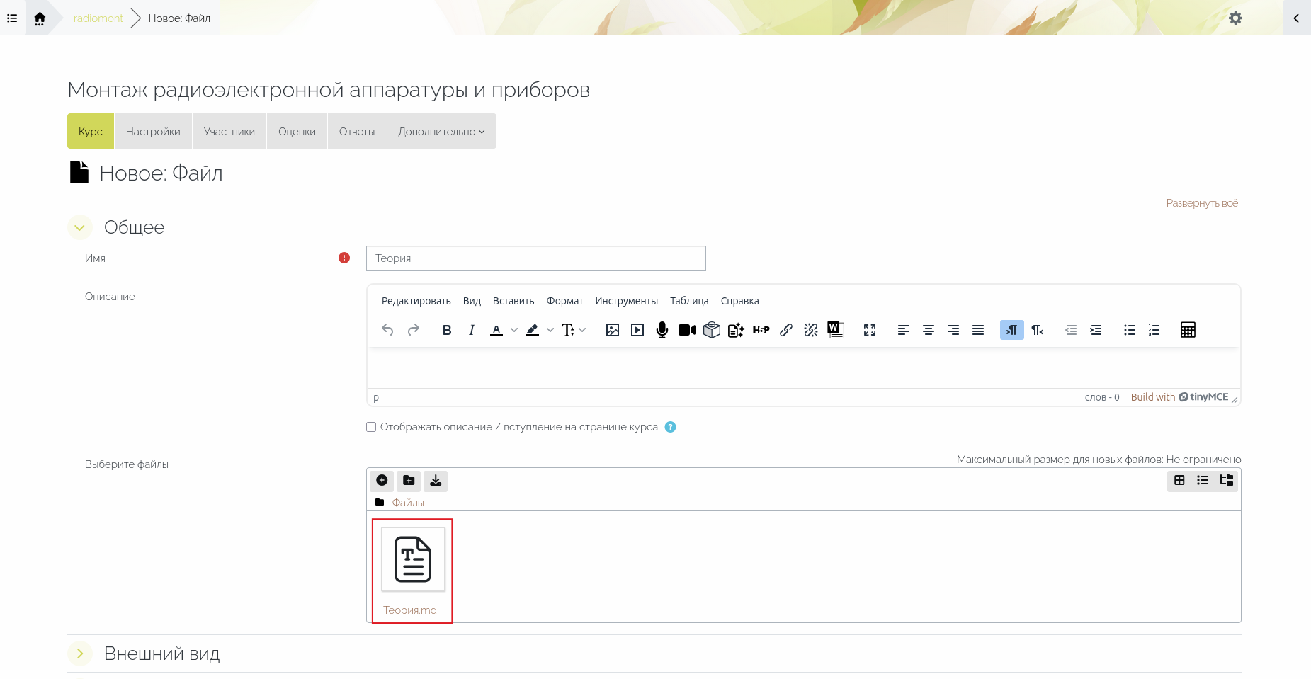 Если создателю курса не важна эстетическая сторона отображения материала и он не планирует редактировать или форматировать содержимое документа, используя для этого инструменты СЭО 3KL, то можно загрузить файл в формате с расширением .md (Markdown) в ресурс «Файл» и настроить его отображение на странице ресурса.