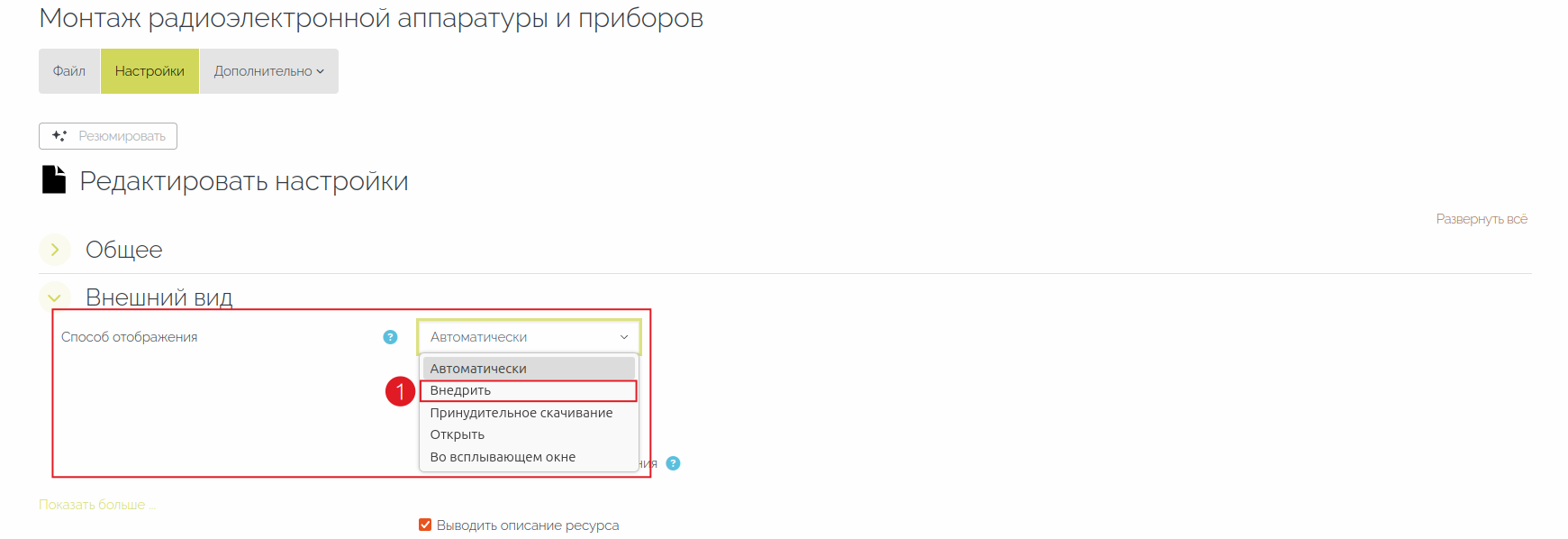 Чтобы содержимое документа отображалось на странице курса, рекомендуется использовать «Способ отображения» - «Внедрить» (см. поз. 1 Рис. 9).